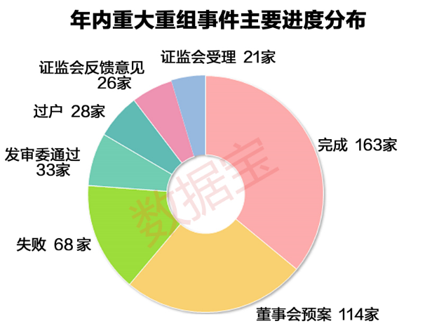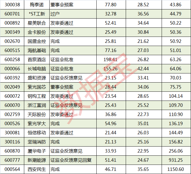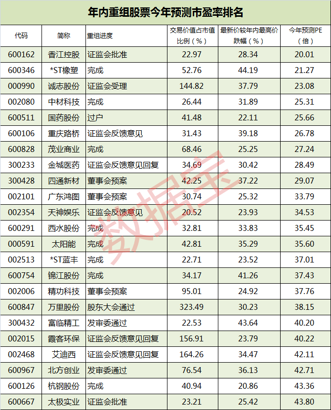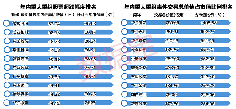 图 将重组进度为证监会暂停审核、失败、股东大会未通过、发审委未通过的上市公司剔除后,沪深两市已完成或者正在进行中的重大重组事项合计共计400多项。其中,交易总价值最大的是长江电力[0.30% 资金 研报]定增收购川云公司100%股权,达797亿元,目前资产已完成过户。交易价值排名第二的是*ST济柴收购中油资本,为755亿元。排名第三的是鼎泰新材[0.00% 资金 研报]发行股份购买顺丰控股,交易总价值433亿元。 此外,天海投资收购IMI、青岛海尔[0.40% 资金 研报]收购通用电气家电业务资产、美的集团要约收购库卡集团等10项重大重组事项交易总价值均超过200亿元。沙隆达A[0.00% 资金 研报]收购ADAMA、新海股份[0.60% 资金 研报]定增收购韵达货运、大杨创世[0.14% 资金 研报]收购圆通速递等20项重大重组事项交易总价值超过100亿元。 值得一提的是,多项价值巨大的重组事项已经完成,长江电力、大杨创世等购买的标的资产已经过户,西安民生[-1.99% 资金 研报]268亿收购供销大集控股、海航基础收购基础产业集团、渤海金控收购Avolon等12项重大重组事项已经宣告完成。 一般来说,相似交易标的构成的重大重组事项对小市值公司的股价刺激作用相对更大。引入标的交易价值除以上市公司最新市值的比值,可以较大程度上反映交易标的资产对上市公司重要程度。 数据统计显示,29家公司牵涉的重大重组事项标的总价值超过其最新总市值。其中,*ST济柴收购的中油资本资产交易总价值是该公司最新总市值的15倍还多;*ST天利收购的中石油工程业务交易总价值是该公司最新总市值的近7倍;此外,*ST舜船收购江苏信托等资产、沙隆达A收购ADAMA、忠旺集团借壳中房股份[0.00% 资金 研报]等重大事项涉及标的资产交易总价值均超过上市公司总市值的4倍。 不过,由于市场、政策等变化,以及重组预案公布后超涨等因素的影响,部分重组股票或重组后的股票股价出现了大幅下挫。其中,拟20亿元收购资产的太极股份[0.09% 资金 研报],最新价较年内最高价跌幅超过52%,主要是其停牌恰好在历史高位所致;已经以8亿元完成资产收购的美亚柏科[-0.13%资金 研报],最新价较年内最高价跌幅同样超过52%。此外,中茵股份[0.28% 资金 研报]、浩丰科技、富春通信[-0.84% 资金 研报]、中际装备[10.04% 资金 研报]等超跌幅度均超过45%。