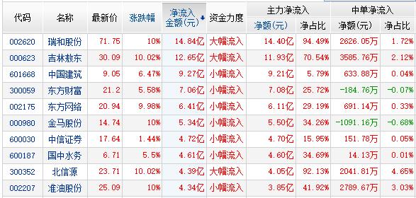 金融界网站资金流向显示:高送转个股继续活跃,其中瑞和股份(71.75 +10.00%,买入)资金净流入14.84亿,北信源(23.71 +10.02%,买入)资金净流入4.39亿。万达私有化概念股国中水务(6.71 +5.50%,买入)资金净流入4.61亿;举牌股异动,其中吉林敖东(30.09 +10.02%,买入)资金净流入12.65亿,中国建筑(9.05 +6.47%,买入)资金净流入9.27亿。股权转让概念股准油股份(25.09 +10.00%,买入)资金净流入4.34亿。尾盘创业板拉升,东方财富(21.20 +5.58%,买入)资金净流入7.06亿。东方网络(20.94 +9.98%,买入)为复牌股资金净流入6.41亿,券商股拉升,中信证券(17.64 +1.44%,买入)资金净流入4.72亿。 (2)资金流出前十: