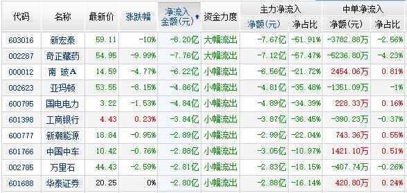 金融界网站资金流向显示:奇正藏药(54.95 -9.99%,买入)为庄股资金净流出7.76亿;部分高送转预期股下跌,其中新宏泰(59.11 -10.00%,买入)资金净流出8.20亿,亚玛顿(53.55 -8.15%,买入)资金净流出4.86亿,万里石(44.43 -2.59%,买入)资金净流出2.81亿;国电电力(3.22 -1.53%,买入)资金净流出4.84亿。