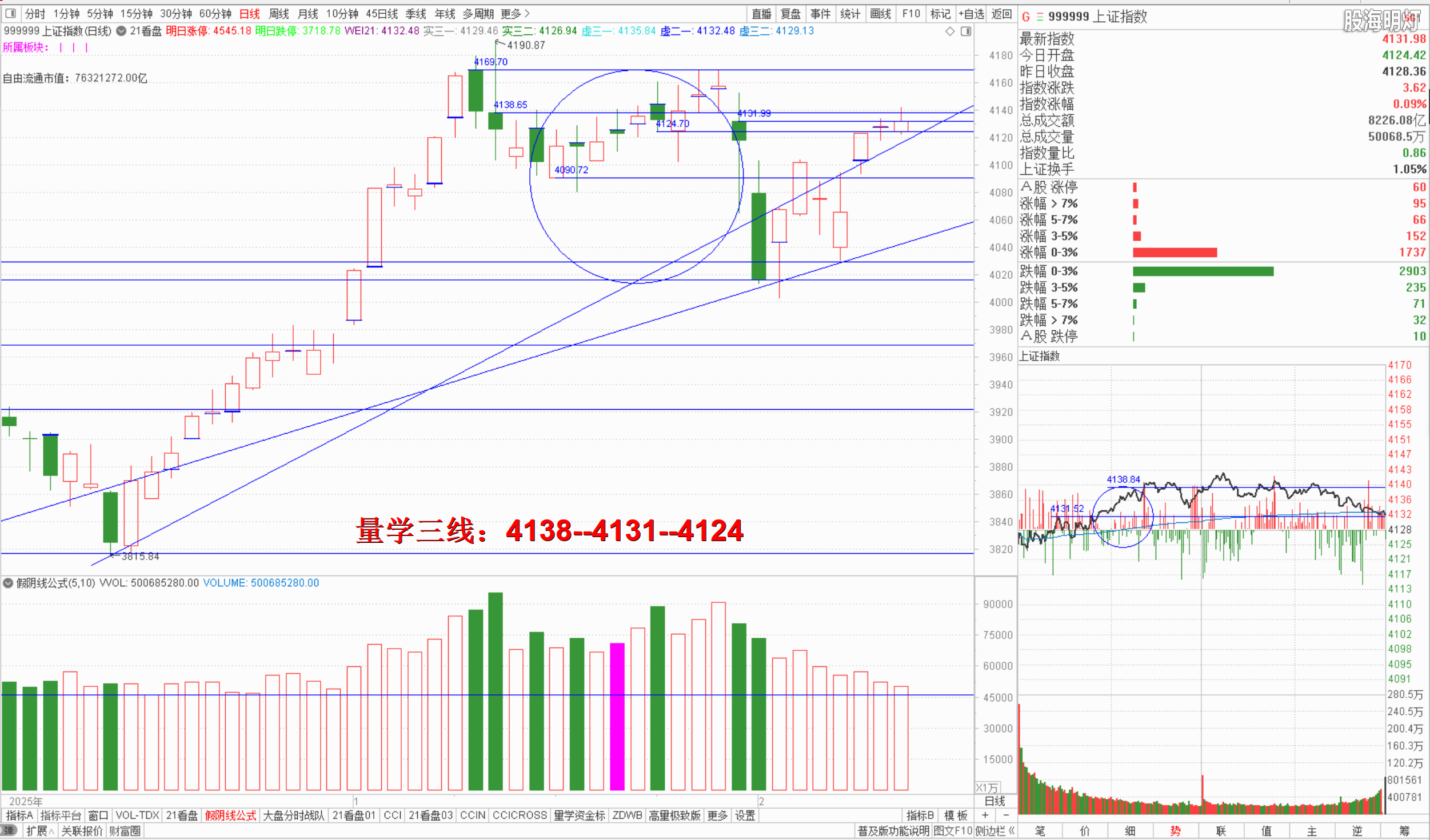 友情提示:股市有风险,入市需谨慎!本文是纯专业量学知识点分享,所有术语均出自量学五本专业教材,本文分析仅代表作者个人观点,我们采用清华大学出版社、经济日报出版社和四川人民出版社《量学经典教材》,旨在记录和验证量学盘前预报,总结提升量学经验,积累历史档案,不为操盘指导,据此实盘者盈亏自负,均与作者无关!好的谷票管一阵子,好的技术管一辈子,学习改变人生,学习改变未来!我们不但教给大家量学技术,更为大家提供适合自己的量学方案,让我们快来一起学习吧! 一、 昨日研判:低开只要继续站稳预定下线4117点不破,一旦可以量波正三维有效站稳预定上线,即可继续大胆模拟训练量学替领精炼知识点;如果跌破4177点但回踩不破昨日阳实底4103点并对应长阴短柱继续明显缩量,依然可以不理指数精炼案例;反之一旦继续强势高开,即可结合量学零号战法知识点结合站稳4138点重要压力位模拟训练精炼案例即可。量学【上日三线】:4131--4128--4117.早盘竞价低开示弱,开盘后回踩预定下线不破,分时量波天线反复回踩人线不破,这时即可继续结合持有案例模拟训练量学替领,其后有效站上预定上线4131点上方可继续结合手中模拟持有案例精炼替领,最终收盘小阳单枪,对应量柱微缩量,整体建构属于量学价升量缩,今日开盘点位与0206号高量假阴虚底形成精准平衡线,明日太极线将于今日精准线形成量学二龙定位,叉上将有中到大阳,叉下将有中到大阴,明日是周四,也是春节前倒数第二日,所以稳健者应该结合自己的量学技术认知,在自己的能力范围之内模拟训练快进快出,本次春节9天假期,休假期间有太多不确定性,稳健者最好提前做好轻松过周末的准备。明日量学【上日三线】:4138--4131--4124.