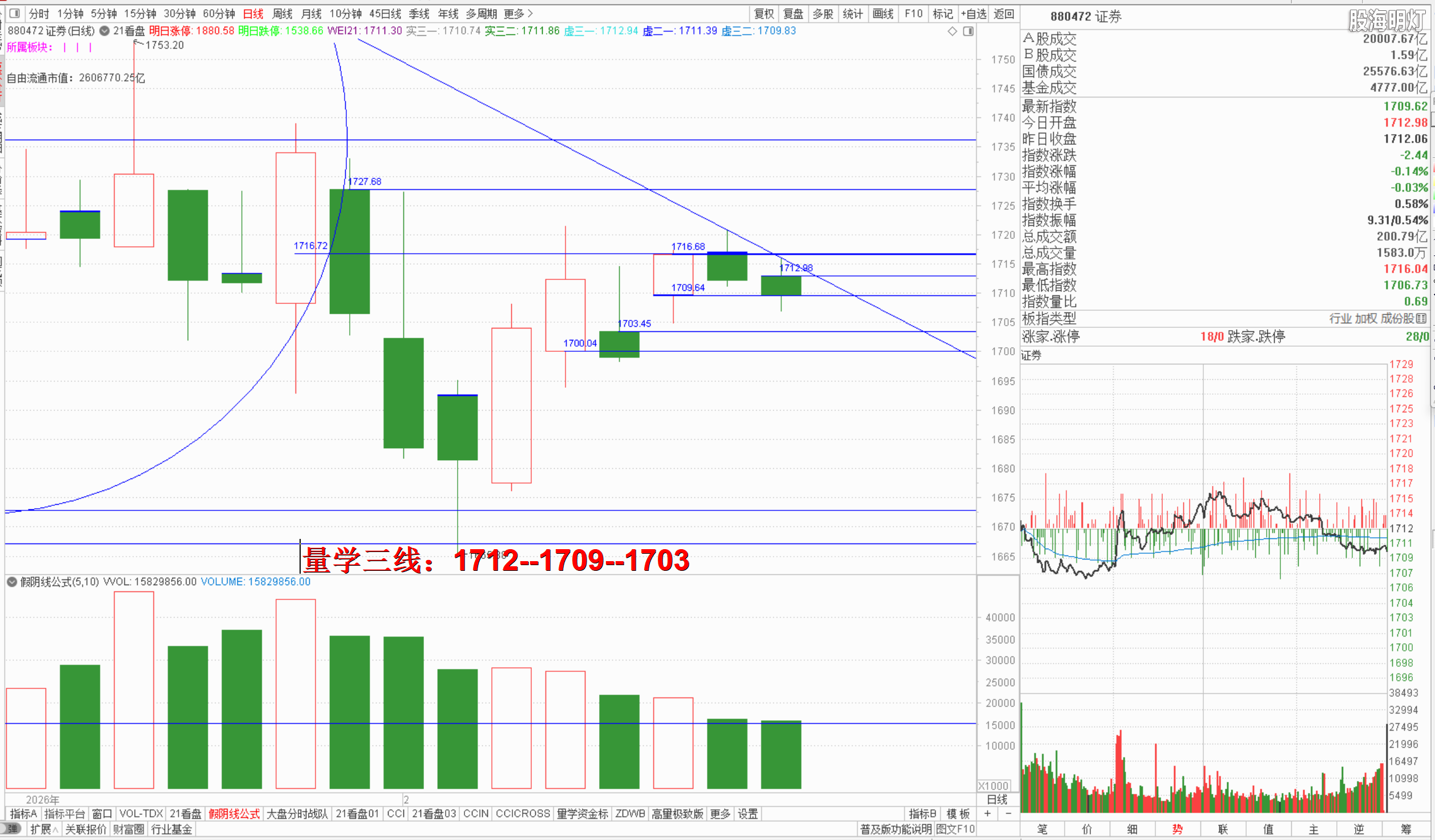二、创业板研判:今天收盘中阴跌破左侧阳实底,明日常态还应惯性下探,今天建构属于量学长阴短柱。量学三段以上高手可继续模拟训练“不理指数,精练个谷”;涨停趋势依然是量学“极阴次阳回马枪战法+凹里淘金战法”为主,今日收盘2只20CM,模拟训练难度非常考验量学功底;后势涨停趋势可继续模拟学习量学凹底淘金知识点+极阴次阳回马枪+康桥战法模拟训练,要特别训练出现首跌缩量,精准回踩重要量线出现有效次阳后出现量学刹车王牌柱知识点后,看不懂量学建构,不明白量学量波技术原理,切忌盘中盲目追涨杀跌,看不懂就不要强求。模拟训练一定要训练在自己认知之内的案例,看不懂的案例还需做到:宁错过,不做错。一般人最好耐心模拟学习量学不见次阳不动心知识点。 明日量学【创业板三线】:3299--3284--3279. 三、板块解析:行业板块【玻璃,化工原料各6板第一;小金属5板第二;专用机械,广告包装各3板第三】;概念板块【新材料14板第一;光伏11板第二;机器人,风电各10板第三】; 新民生类热点,新能源类与新科技类辅助;明日继续跟踪主线板块新科技与新能源类轮动,今日建构新科技普遍走弱,稳健者需静候次阳; 昨日预判黄金防跌,今日次阳反包量性有所转强,同时卧底刹车王牌已成,明日看继续模拟跟踪能否竞价零号正三维;AI营销板块今日不过左峰大阴回踩,建构属于量学长阴短柱,可继续紧盯回踩到位出现次阳的波段模拟训练机会。 距离传统春节越来越近了,短线级别可适当模拟学习商业连锁,食品饮料等内需类板块机会,但有一点需要注意,就是此类板块持续性不强,一旦滞涨需模拟训练快速落袋。 风向标证券,收盘小阴对应量柱明显缩量,收盘进准对应左侧阳实底,明日将面临量学一剑封喉处,叉上中到大阳将推升大盘,反之下叉需预防大盘跟随回落。