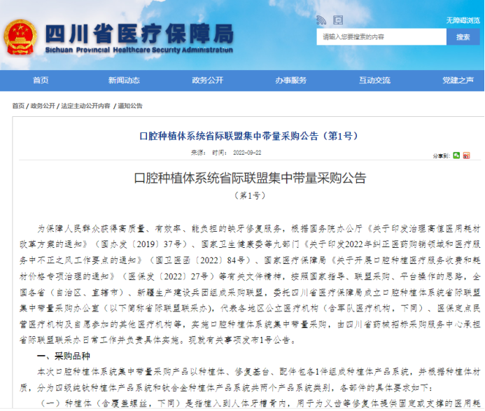 9月22日,口腔种植体系统省际联盟集中带量采购办公室正式发布《口腔种植体系统省际联盟集中带量采购公告(第1号)》(以下简称《1号公告》)。《1号公告》明确了采购品种、采购规则、后续工作安排等多个方面的内容。