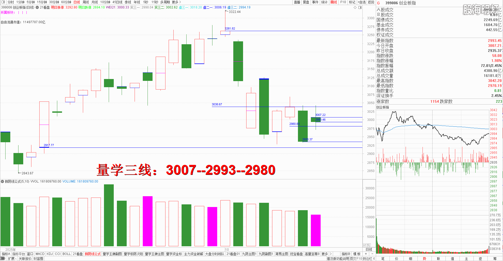 二、创业板研判:今天收盘假阴真阳十字星,对应量柱微缩量,明日还需有效真阳确认,不能确认假阴,还需预防继续下行,量学三段以上达人依然可继续模拟训练“不理指数,精练个谷”;涨停趋势依然是量学“极阴次阳回马枪战法+凹里淘金战法”为主,今日收盘8只20CM,模拟训练难度明显增大;后势涨停趋势可继续模拟学习量学凹底淘金知识点+极阴次阳回马枪+康桥战法模拟训练,要特别训练出现首跌缩量,精准回踩重要量线出现有效次阳后出现量学刹车王牌柱知识点后,看不懂量学建构,不明白量学量波技术原理,切忌盘中盲目追涨杀跌,看不懂就不要强求。模拟训练一定要训练在自己认知之内的案例,看不懂的案例还需做到:宁错过,不做错。一般人最好耐心模拟学习量学不见次阳不动心知识点。 明日量学【创业板三线】:3007--2993--2980