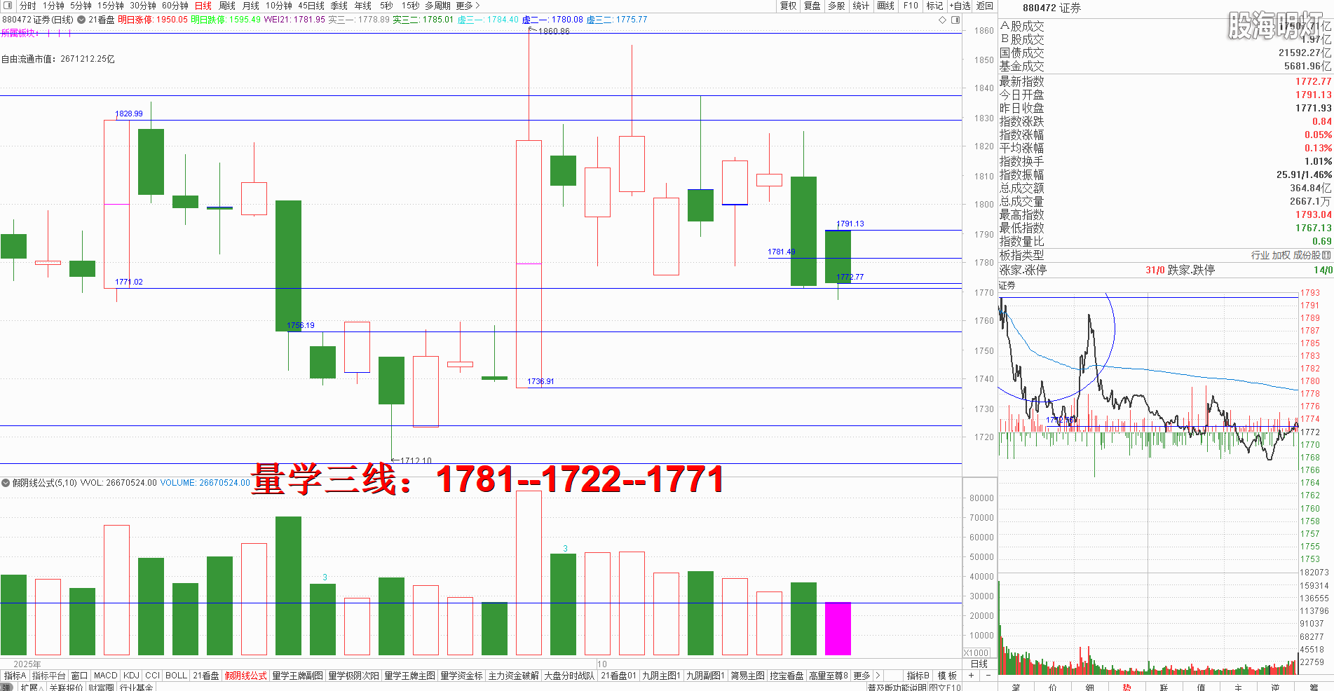 三、板块解析:行业板块【工业机械8板第一;供气供热,化工,煤炭各7板第二;元器件,通信设备,房地产,电气设备各5板第三】;概念板块【机器人16板第一;一带一路15板第二;新能源车,物联网各13板第三;芯片,人工智能各12板第四;工业互联,风电,光伏,国防军工各10板第五】;今日新科技类热点,新内需与新科技相对活跃,新能源与新基建类辅助;主线方向新科技与新能源继续模拟跟踪板块轮动,主线方向整体次阳未达标,还需跟踪有效次阳出现后的模拟学习机会。风向标证券,早盘竞价高开后,开盘稍作震荡即盘中猛烈跳水,严重拖累大盘反弹节奏,其后盘中恐龙波急拉反弹后再次猛烈跳水挖坑,收盘小中阴假阴,对应量柱缩量为近期低量柱,明日能否出现有效真阳盖掉今日假阴实顶,是大盘能否快速出现有效次阳反弹的关键,一旦券券不能确认今日假阴,且继续跌破1771点重要黄金谷底线,必然拖累大盘继续下探,所以只要风向标券券没有出现有效次阳之前,稳健者务必耐心等候,不要急于一时。
