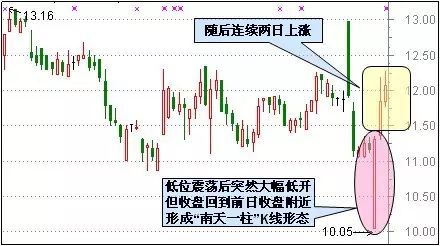 股价在低档经过长时间盘整,某一日突然被大幅拉高,尾盘又回落至较低位收盘,从而在日K线上留下一条长上影线阳线。长长的上影乃主力试盘所为,意味着主力的收集已经完成,即将开始拉抬。次日如放量拉出大中阳线突破向上,即可确认反弹开始 25、“南天一柱”。