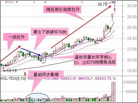 股价加速下行,在低档位拉中长阴线,恐慌盘的涌出导致最后竟跳空拉出中大阴线,但第二天大势却急转直上,直接跳高至前一日大阴的开盘价之上开盘,盘中虽有可能再探低位,但收盘价仍在前一日的开盘价之上,留下一条前后皆无K线的大阴线,在收盘之前若确定,则是较佳的低吸点 12、“猪笼入水”。 经过低位收集的猛烈拉升,在高位形成尖顶后,单边下行不做头部的确认动作,在接近60日或150日均线时,以一根中阴线向下突破,走势吓人,但5曰乖离率出现明显背离,这是缩量洗盘结束的最佳买点。随之而来的将是一波向上攻击前期高点的行情。