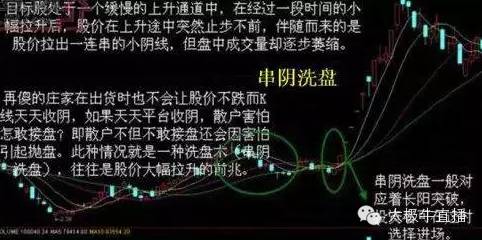 目标股处于一个缓慢的上升通道中,在经过一段时间的小幅拉升后,股价在上升途中突然止步不前,伴随着而来的是股价拉出一连串的小阴线,但盘中成交量却逐步萎缩。串阴洗盘一般对应长阳突破,投资者可在这时选择进场。