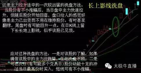 这是主力拉升途中的一次较迅猛的一次洗盘方法。当股价有不小涨幅后,当日盘中主力快速拉升,但随后股价开始回落,盘口给人的感觉好像是主力已出货,而不用在维持股价。有时甚至翻绿,尾盘时有可能回升一点。在日K线上留下长长的下影线,视乎该股已见顶。