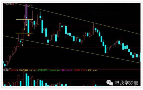 案例:这是中航光电2010年11月2日的K线图,已经构成黄昏之星,我们把那周的几根K线分成1234四个编号,注意单从12两根K线我们继续认为该股处在超强区域,后市仍可看涨,但是随后第三根K线,收出了巨量十字线,这个K线振幅很大,多空分歧严重加大,并且上影线很长,已经有主力出货的嫌疑,那么此刻对后市不确定最好获利减仓,随后的第4根K线解释了一切,注意:第4根K线击穿了第2根K线的实体的一半以下,这是极端的出货信号,清仓不犹豫,虽然后面2天反复,但是不是短线高手最好不要参与,随后该股果然延续了漫长的下跌通道!