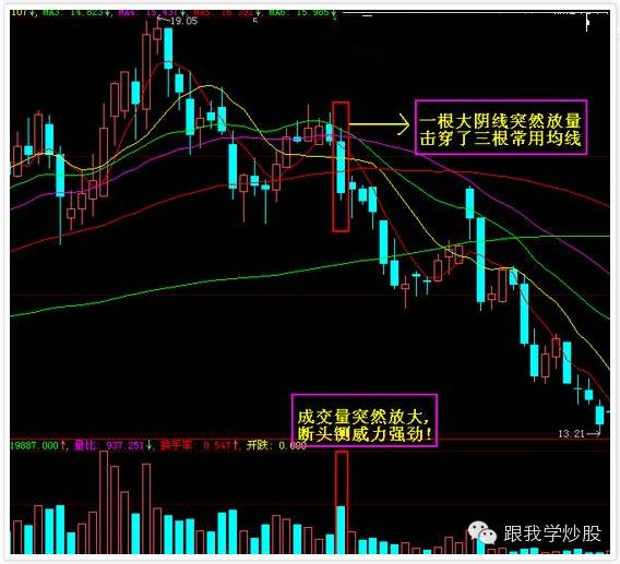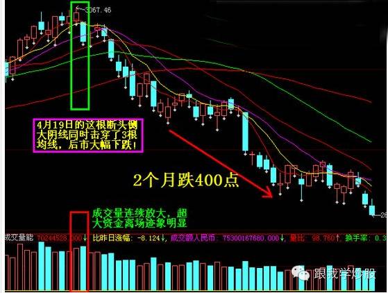 应用法则:一根大阴线切断了三根均线,改变了均线的排列为空头排列,后势看空。案例1: