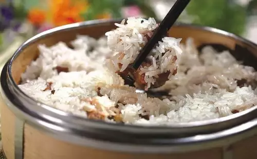 第四大秘籍——增香:如果您家里的米已经是陈米,没关系,陈米也可以蒸出新米的味道。就是在经过前三道工序后,我们在锅里加入少量的精盐或花生油,记住花生油是必须烧熟的,而且是晾凉的。只要在锅里加入少许就可以。现在,可以插上电,开始蒸。蒸好了,粒粒晶莹饱满,米香四溢。