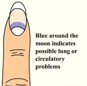 美国福罗里达州克利夫兰医学中心的皮肤科医生,塔玛拉·利澳,就曾经观察到他的病人指甲上出现蓝色而建议其对肺部进行检查。因为,指甲上的蓝色表明所获氧气不足。果不其然,检查证实该病人肺部有积水。