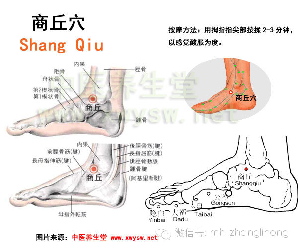 商丘穴在内踝骨的前缘偏下一点。商丘穴正好对应足底反射区中的下身淋巴反射区,因此可以治疗各种炎症。同时它又揭示了一个医理:炎症一般是由细菌感染引起的。因为脾是管运血的,它能把新鲜血液运到病灶上去,脏东西被清走后,炎症自然就消除了。 商丘穴多用于神经性呕吐,消化不良,急、慢性胃炎,急慢性肠炎,腓肠肌痉挛,踝关节及周围软组织疾患等。