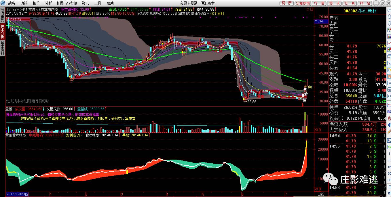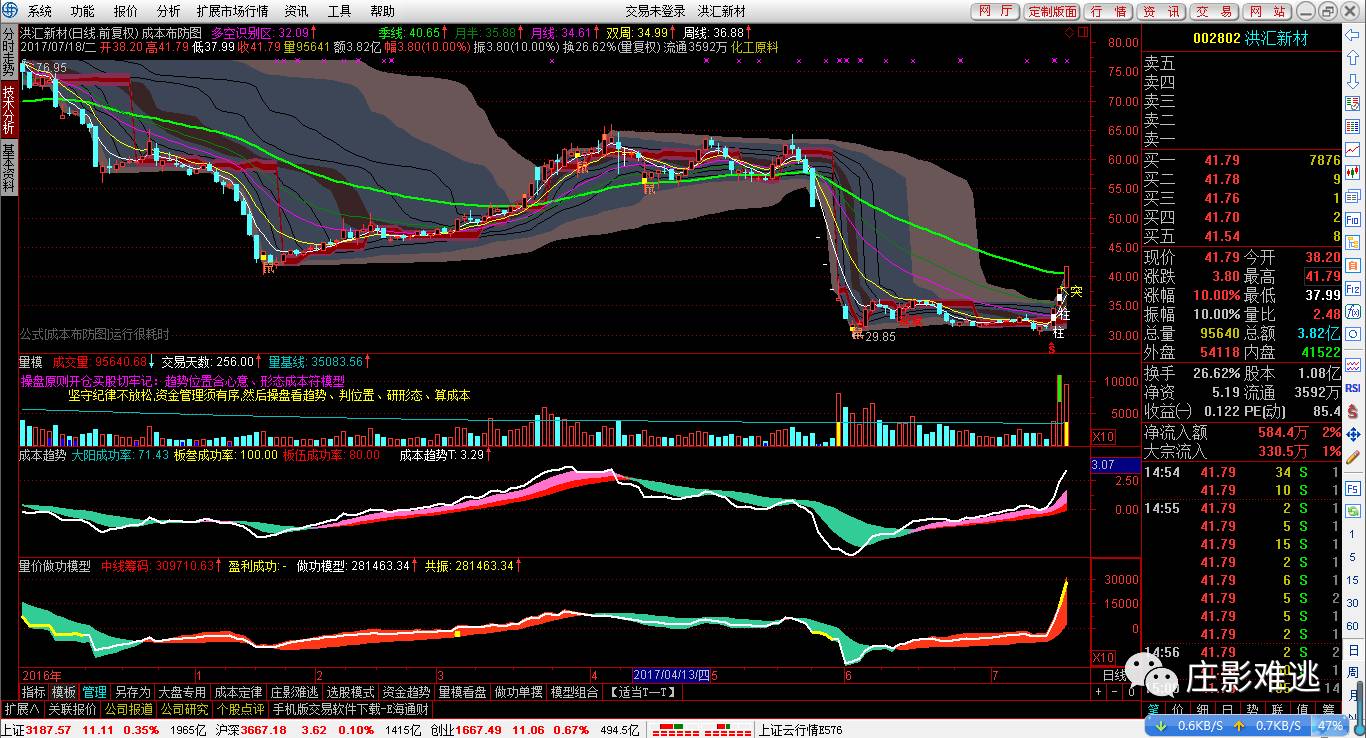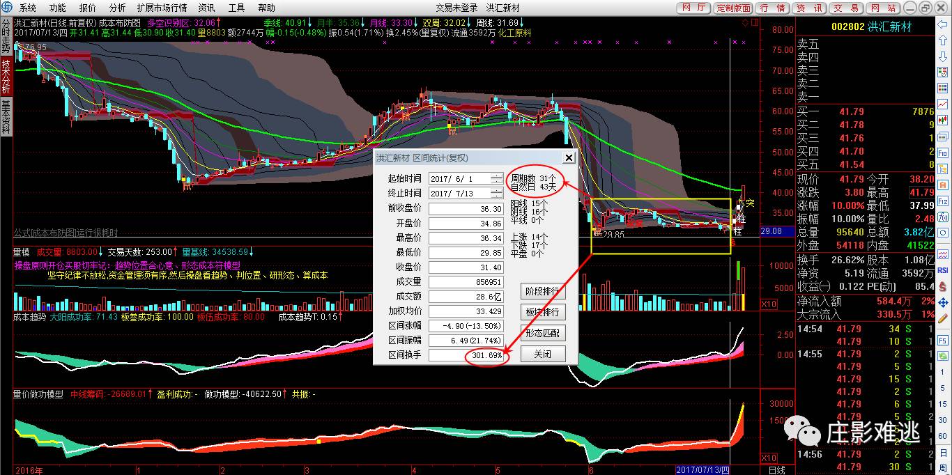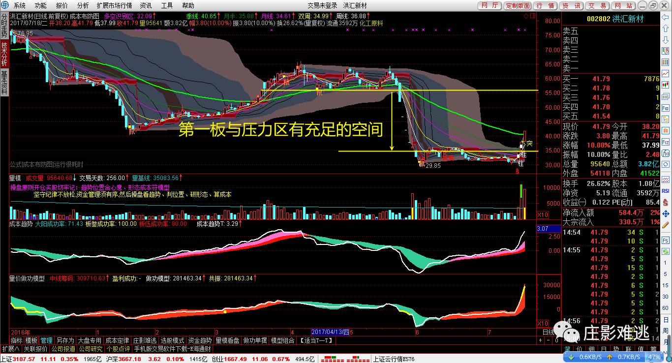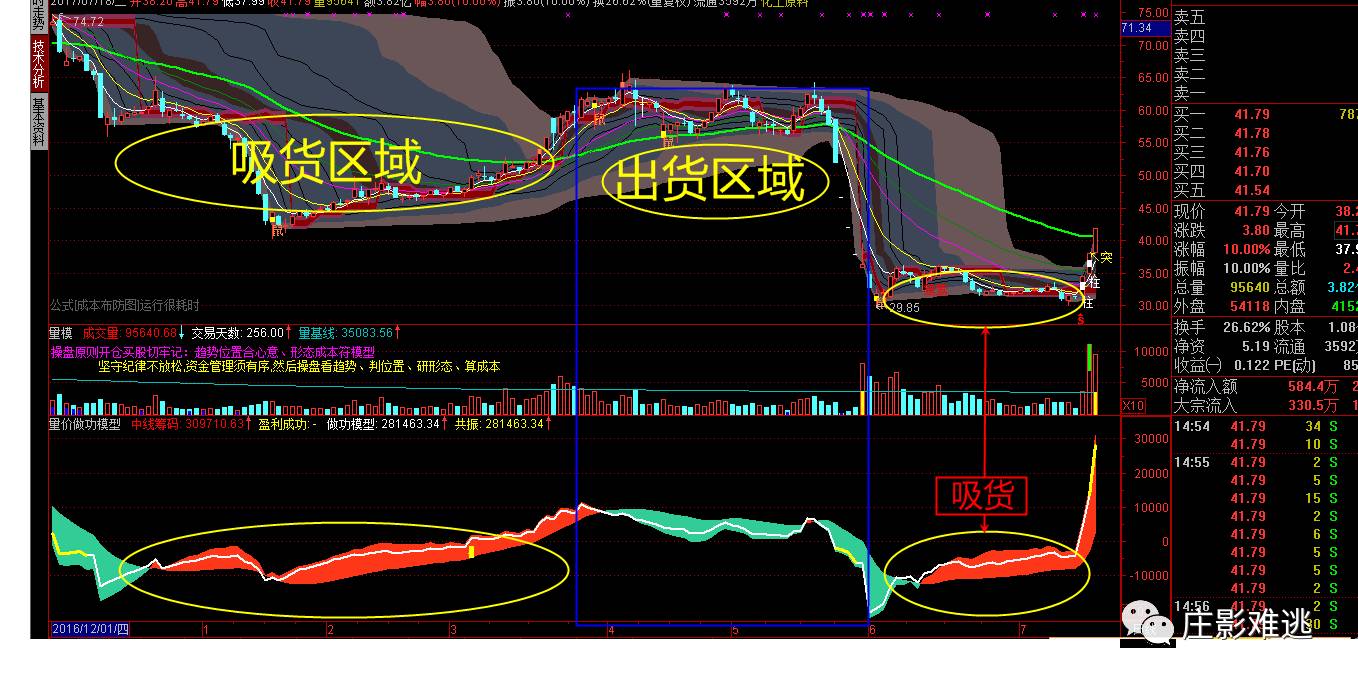 除了量价模型理论可以为我们判定主力的进出区域,我们还有【成本定律】也可以用来判断主力是否建仓或出货,如下图的成本趋势,就是依据我们的【成本定律】而改写的指标,作用和【量价模型理论】一样,可以用来判定主力建仓和出货的位置区域·! 主力拉板有的连拉一个,有的连拉很多个,就算不连拉板,涨的幅度有多有少,有的涨一两倍或很多倍,有的涨个百分之几十就没戏了,怎么判断呢? 这个我们也同样的用量价模型理论来判断的,依据【量价模型的正态分布原理】,主力建仓每天买入的筹码有20%是不动的,这就是主力的底仓,我们只要大概算一下主力的控盘的筹码,就能知道主力有多少货在手。怎么算呢?有个最简单的方法,当然前提是要在这一段主力是在建仓,如果不是建仓就不能这样算!请看下图,最近这一建仓区域共用时31个交易日,换手300%,所以按20%的底仓算,主力共吸筹60%的流通盘!