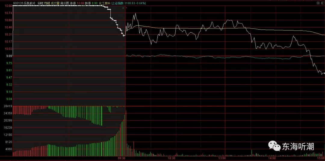 实例2 :乐凯胶片 乐凯胶未匹配量最后趋于0,吃掉买盘,匹配量从大量绿盘变为红绿相间,最后收绿盘,多方力量不小,空方占优,走势会延续。因昨天涨停,早盘延续上冲,开盘后,上冲接近9个点,但因成交量不能跟上,然后收绿。