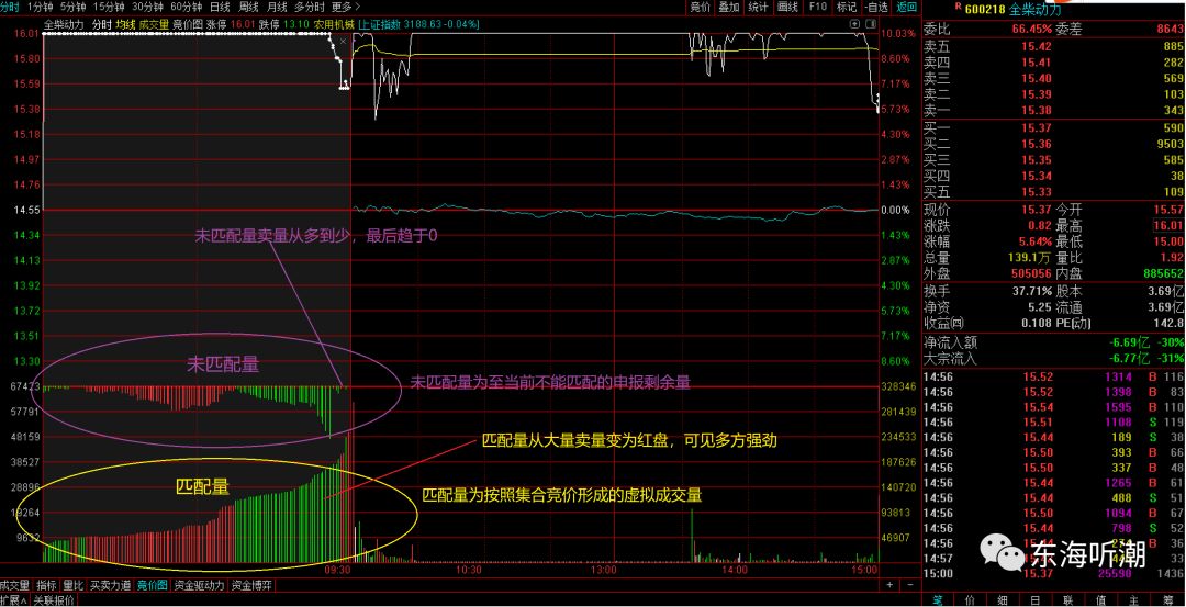 集合竞价的主要分为两部分,见上图。上方的未匹配量(倒立量柱)和下方的匹配量(正立量柱)。匹配量为集合竞价形成的虚拟成交量,而未匹配量是不能匹配成交的剩余申报量,换句话说力量强的那一方,这句话很重要。 另外需要注意的一点是:中国的集合竞价有着特殊的一点,就是9点15-9点20可以撤单,9点20-9点25就不能再撤单了。可见9点20之后的成交量比较重要。 实例1 :全柴动力 下面以全柴动力为对象,分析一下,集合竞价主力的行为打算。9点20以后,未匹配量从大量卖量然后趋于0,表明多方把空方的多余量给吃掉了,多方至少不大幅弱于空方。匹配量上,显示主力将大量的买盘吃掉,最后9点25分时候,还表现出买方占优,推知股票早盘买方主力资金没有抛压,且比较有实力,看多。