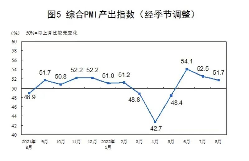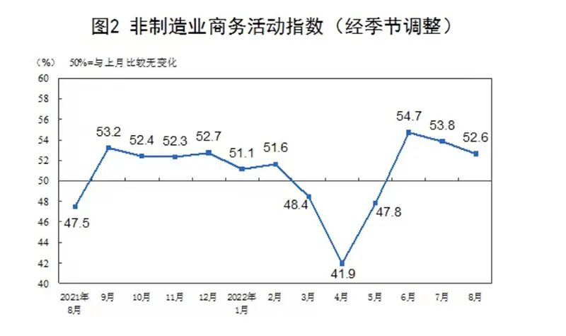 8月非制造业商务活动指数和综合PMI产出指数分别为52.6%和51.7%,比上月下降1.2和0.8个百分点,继续位于扩张区间。