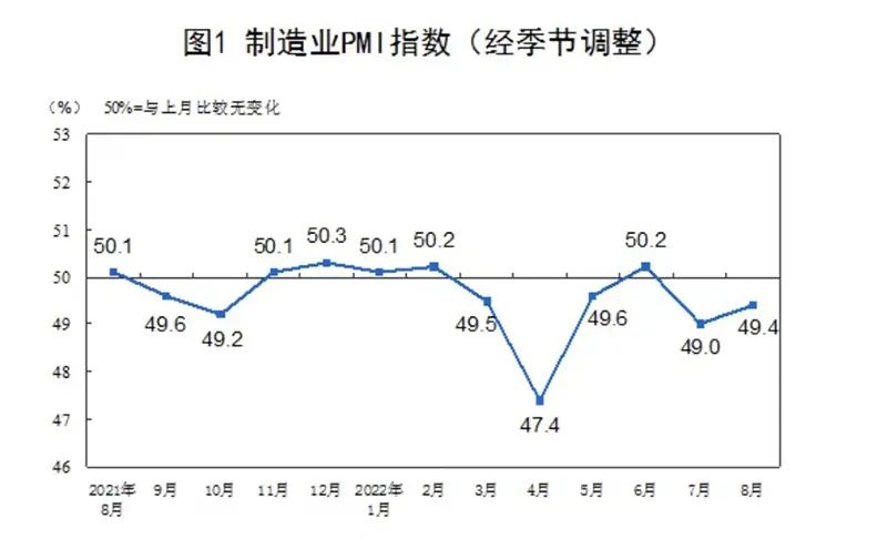 国家统计局今日公布的数据显示,8月份制造业采购经理指数(PMI)为49.4%,比上月上升0.4个百分点。
