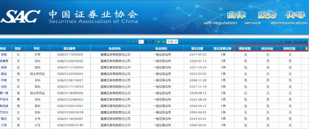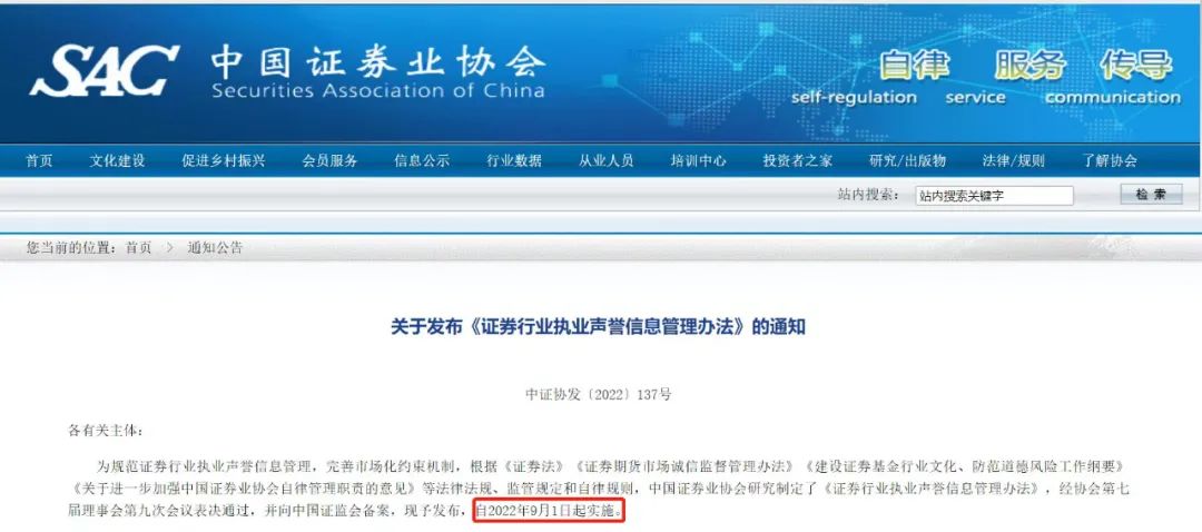 券业版个人征信系统已经上线。 9月1日,《证券行业执业声誉信息管理办法》(下称《管理办法》)正式实施。与此同时,中国证券业协会(下称协会)也同步更新了从业人员的公示信息栏目。公示信息在原来的基础上,新增了“表彰奖励”“违法失信”“其他正面信息”“其他负面信息”等栏目。 “这个执业声誉,差不多是将从业人员职业经历过程中的重大奖惩、正负面信息都收录进去了,是个人的从业档案,对个人的执业会起到一定的约束作用。从业人员要珍惜自己的执业声誉”,某头部券商人士向记者表示。 “券业版个人征信系统” 执业声誉信息管理的推出,有一定的背景。 据了解,《关于进一步加强中国证券业协会自律管理职责的意见》(下称《意见》)提出,协会要“构建市场化的自律约束、道德约束、诚信约束、声誉约束机制”。为贯彻落实《意见》,进一步建立健全证券行业执业声誉管理机制,加强对行业主体的自律约束、声誉约束,充分发挥市场化约束机制的作用,服务好注册制改革,协会组织起草了《管理办法》。