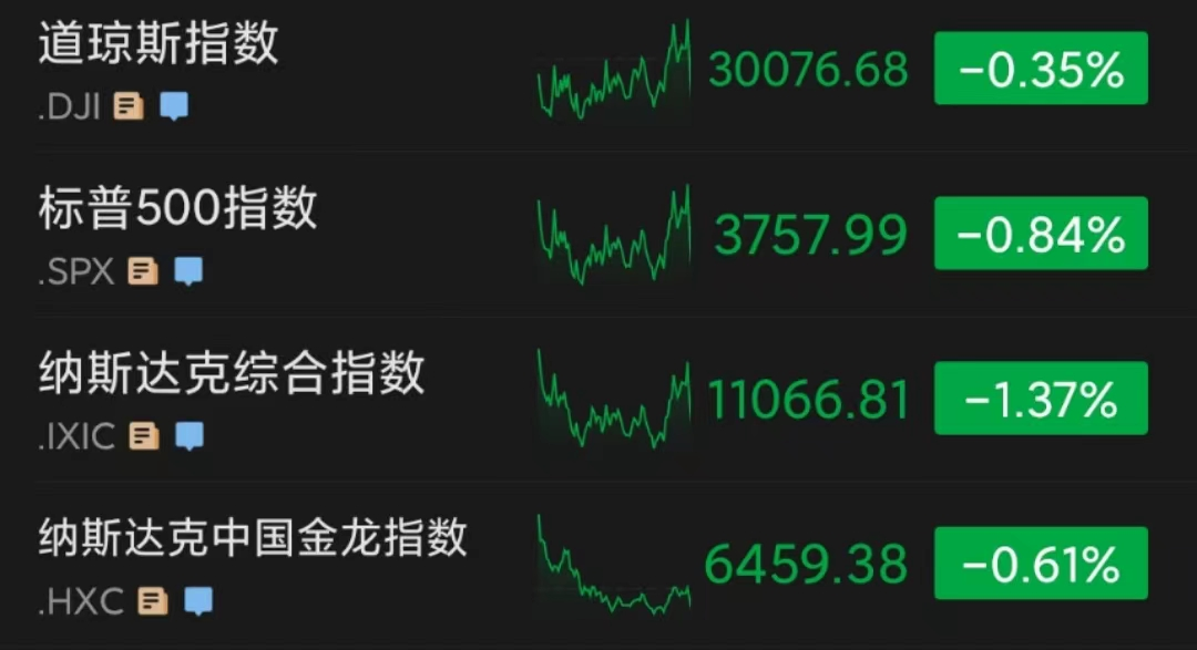当地时间周四,美股三大指数集体下挫。道指跌0.35%,标普500指数跌0.84%,纳指跌1.37%,均录得“三连跌”。 大型科技股涨跌互现,英伟达跌5.28%,特斯拉跌超4%。航空股全线受挫,捷蓝航空跌超7%,波音、美国航空跌超3%。美国证券交易委员会(SEC)称,波音将支付2亿美元以和解SEC的诸多指控。 美联储此前一天宣布大幅加息75个基点后,全球多国央行跟进。其中,瑞士央行加息75个基点,挪威和英国央行则宣布加息50个基点。美国财政部长耶伦表示,她相信美联储在控制物价方面能够取得成功,通货膨胀明年会下降,也许无法达到2%的通胀目标。 美股三连跌,逼近6月份低点美股三大指数开盘涨跌不一,盘中震荡下挫,道指虽然尾盘转涨,但在收盘前小幅跳水。截至收盘,道指跌0.35%,收于30076.68点,一度跌破30000点大关;标普500指数跌0.84%,报收3757.99点;纳斯达克指数跌1.37%,收于11066.81点。