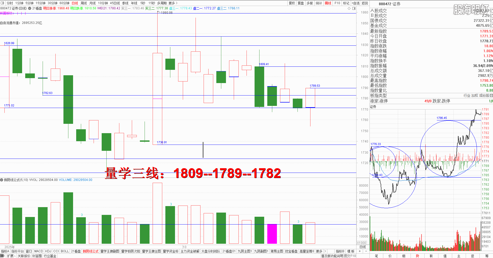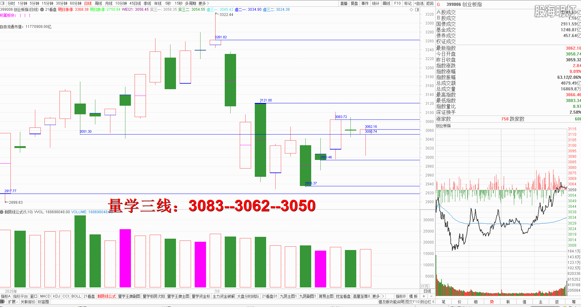 二、创业板研判:今天收盘长腿假阳,对应量柱微增量,明日只要真阳确认刹车王牌柱就构建完成且量性转强,短线血手与量学三段以上达人依然可继续模拟训练“不理指数,精练个谷”;涨停趋势依然是量学“极阴次阳回马枪战法+凹里淘金战法”为主,今日收盘8只20CM,模拟训练难度非常考验量学功底;后势涨停趋势可继续模拟学习量学凹底淘金知识点+极阴次阳回马枪+康桥战法模拟训练,要特别训练出现首跌缩量,精准回踩重要量线出现有效次阳后出现量学刹车王牌柱知识点后,看不懂量学建构,不明白量学量波技术原理,切忌盘中盲目追涨杀跌,看不懂就不要强求。模拟训练一定要训练在自己认知之内的案例,看不懂的案例还需做到:宁错过,不做错。一般人最好耐心模拟学习量学不见次阳不动心知识点。 明日量学【创业板三线】:3083--362--3050。 三、板块解析:行业板块【建筑11板第一;煤炭8板第二;软件服务,房地产,工业机械,传媒娱乐,化工,有色各4板第三】;概念板块【人工智能16板第一;一带一路13板第二;粤港澳12板第三;DeepSeek11板第四;东数西算10板第五】;今日新科技热点,新基建(内需类)与新能源辅助;主线方向新科技与新能源继续模拟跟踪板块轮动,主线方向整体量性转弱,还需跟踪后势刹车王牌柱量性转强的。风向标证券,早收盘微高开后,开盘小幅急拉后即快速下跌挖坑,盘中反复剧烈挖坑后快速拉起,最终收盘长腿小阳次阳盖阴,量价形成双向阳胜,明日强势应该竞价高开,一旦能够正三维健康向上就将助力大盘上攻左峰,反之该涨不涨,还需预防再次拖累大盘。