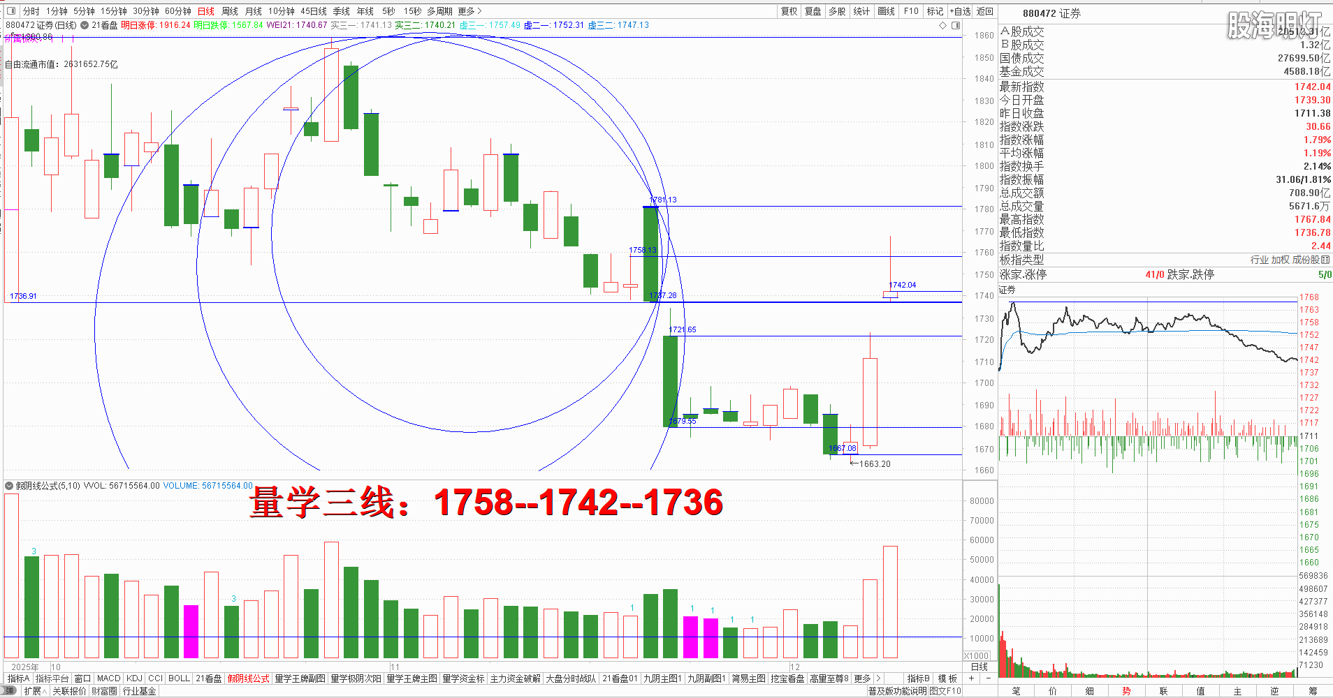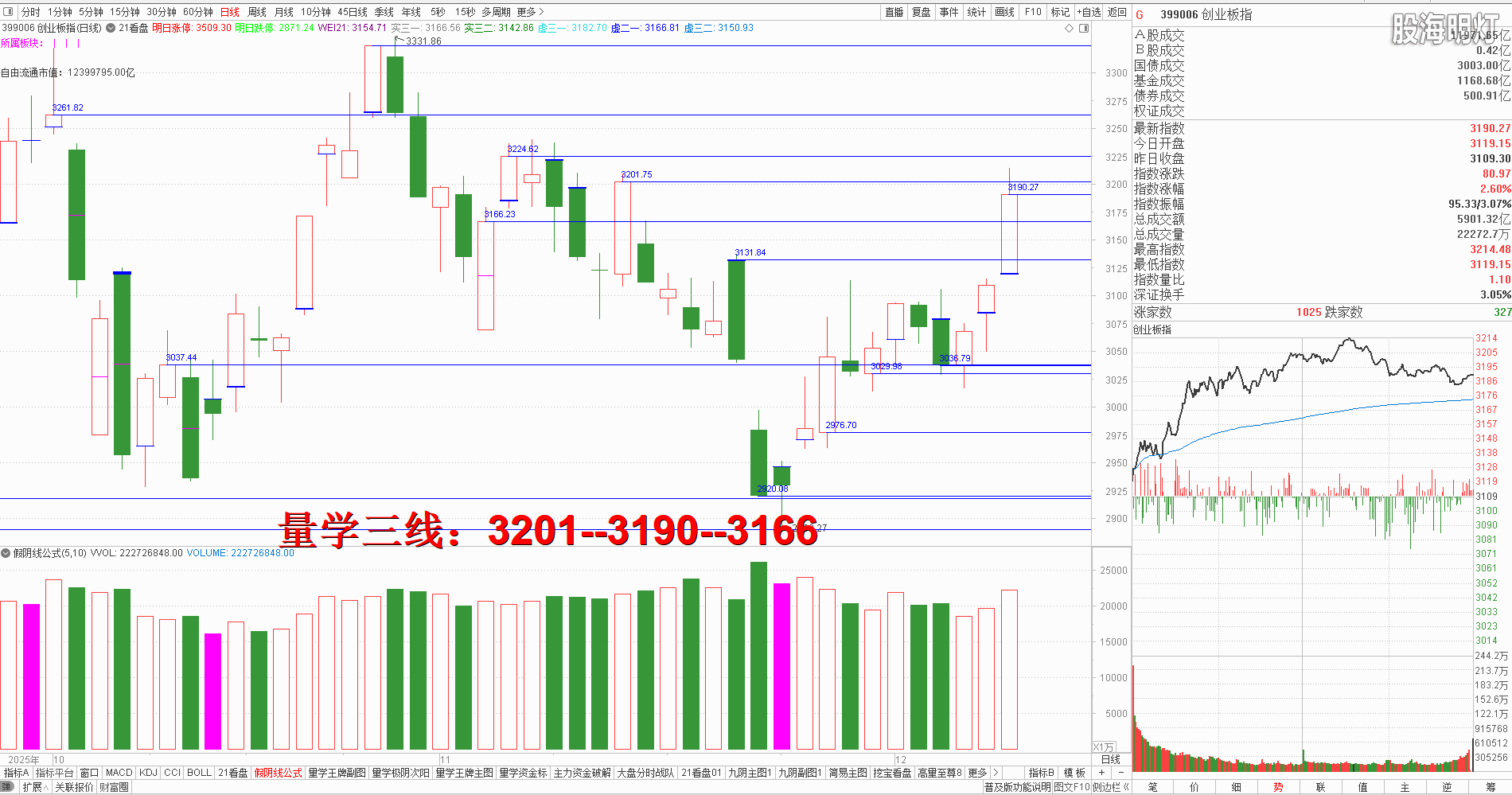 二、创业板研判:今天竞价 高开后震荡上攻,下午受大盘回落影响跟随回落,收盘中阳单枪,对应量柱梯量第三柱,明日进入量学“盯三防四”,量学三段以上高手可继续模拟训练“不理指数,精练个谷”;涨停趋势依然是量学“极阴次阳回马枪战法+凹里淘金战法”为主,今日收盘5只20CM,模拟训练难度非常考验量学功底;后势涨停趋势可继续模拟学习量学凹底淘金知识点+极阴次阳回马枪+康桥战法模拟训练,要特别训练出现首跌缩量,精准回踩重要量线出现有效次阳后出现量学刹车王牌柱知识点后,看不懂量学建构,不明白量学量波技术原理,切忌盘中盲目追涨杀跌,看不懂就不要强求。模拟训练一定要训练在自己认知之内的案例,看不懂的案例还需做到:宁错过,不做错。一般人最好耐心模拟学习量学不见次阳不动心知识点。 明日量学【创业板三线】:3201--3190--3166。 三、板块解析:行业板块【元器件10板第一;软件服务,建筑,商业连锁各5板第二;电气设备,通用机械,有色各4板第三】;概念板块【海峡西岸22板第一;新能源车,人工智能,国防军工各17板第二;芯片,商业航天,5G,各14板第三】;今日新内需热点,新科技,新能源与军工类辅助;主线方向新科技与新能源继续模拟跟踪板块轮动,主线类板块模拟训练不见九阴不下车知识点,军工注意模拟学习过峰保顶能否成功。风向标证券,早盘竞价高开后上攻左侧大阴二一位不能有效站稳,下午天线跌破人线后震荡挖坑,收盘小阳长枪,对应量柱明显放量形成梯量第三柱,结合今日建构有明显滞涨的表现,明日进入量学“盯三防四”,明日只有缩量站稳今日梯三柱实顶上方并明显缩量则大盘无忧,反之一旦券券有效跌破1736点高量大阳实底,就需谨防中大阴回踩下方高量大阴实顶1721点,一旦券券大幅回踩,必然影响大盘上攻节奏,所以稳健者务必看清楚明日券券方向选择明确之后结合量学顺势而为知识点模拟学习。