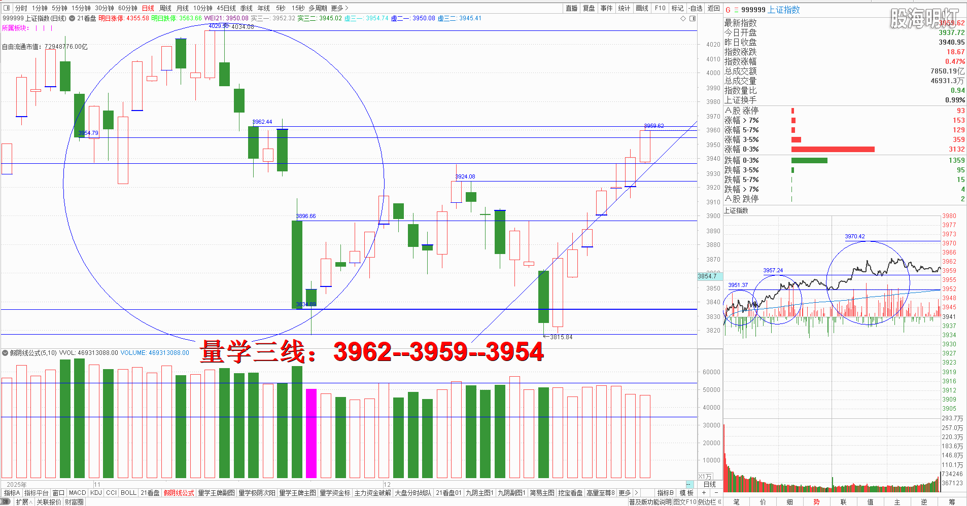 友情提示:股市有风险,入市需谨慎!本文仅代表作者个人观点,我们采用清华大学出版社、经济日报出版社和四川人民出版社《量学经典教材》,旨在记录和验证量学盘前预报,总结提升量学经验,积累历史档案,不为操盘指导,据此实盘者盈亏自负,均与作者无关!好的谷票管一阵子,好的技术管一辈子,学习改变人生,学习改变未来!我们不但教给大家量学技术,更为大家提供适合自己的量学方案,让我们快来一起学习吧! 一、 昨日研判:常态应该继续看涨,结合量学三线知识点,只要继续量波正三维有效站稳3945点阴半上方,即可继续模拟训练量学替领精练知识点,短线选手可模拟训练量学“四进”知识点,周五结合3960点大阴实顶突破站稳模拟持有待涨,触及不过模拟训练量“五出”享受轻松过周末的乐趣。反之明日一旦该涨不涨,有效跌破预定下线,稳健者盘中先模拟训练量学替领控仓后再观察后势。量学【上日三线】:3945--3940--3936.早盘竞价低开,开盘精准回踩下线后快速拉升,盘中有效站稳预定上线即左侧阴半后即可继续模拟训练量学替领精练知识点,下午震荡上攻至3962点大阴实顶未能有效站上,收盘中阳单枪对应量柱微缩量,结合今日量价建构属于量学价升量缩,常态还应继续看涨,但是结合量学 三线空间看跌防涨,明日还需结合开盘定势,不能强势竞价高开就必须量波正三维有效站稳预定上线上方且继续价升量缩,达标方可模拟持有过周末,反之一旦出现滞涨或次阴,就需先结合量学“五出”知识点,模拟学习量学轻松过周末,因为截止今日收盘,大盘已经连续上涨7日,明显已经进入量学“极阳”知识点,所以一旦出现滞涨或次阴,就需预防后势出现深幅回踩可能。明日量学【上日三线】:3962--3959--3954.