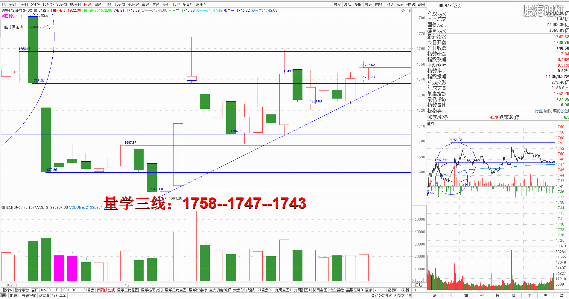 二、创业板研判:今天收盘跳空假阳阳长腿十字星,对应量柱未整理,收盘继续站稳3224点左峰,明日只要继续站稳左峰不破,量学三段以上高手可继续模拟训练“不理指数,精练个谷”;涨停趋势依然是量学“极阴次阳回马枪战法+凹里淘金战法”为主,今日收盘6只20CM,模拟训练难度非常考验量学功底;后势涨停趋势可继续模拟学习量学凹底淘金知识点+极阴次阳回马枪+康桥战法模拟训练,要特别训练出现首跌缩量,精准回踩重要量线出现有效次阳后出现量学刹车王牌柱知识点后,看不懂量学建构,不明白量学量波技术原理,切忌盘中盲目追涨杀跌,看不懂就不要强求。模拟训练一定要训练在自己认知之内的案例,看不懂的案例还需做到:宁错过,不做错。一般人最好耐心模拟学习量学不见次阳不动心知识点。 明日量学【创业板三线】:3206--3239--3229。 三、板块解析:行业板块【汽车类9板第一;航空8板第二;建筑,电气设备,工业机械,通用机械各6板第三】;概念板块【商业航天29板第一;国防军工27板第二;新能源车24板第三,机器人21板第四;一带一路,卫星导航各17板第五】;今日新内需热点,新能源与新科技类辅助;主线方向新科技与新能源继续模拟跟踪板块轮动,主线类板块今日量性稍有转弱迹象,明日一旦量性继续转弱,稳健者可先结合量学“五出替领”知识点模拟训练了,学会享受轻松过周末的乐趣。风向标证券,早盘竞价低开示弱,开盘后精准回踩预定下线得到支撑后快速拉升,其后全天依托人线盘中反复剧烈震荡挖坑,收盘小阳单枪对应量柱微增量,结合量学三先规律量柱语言解读今天有明显滞涨的表现,明日还有回踩最近高量实顶1743点需求,一旦回踩不破且继续站稳今日阳实顶并对应缩量则大势无忧,反之一旦有效跌破预定下线,必然影响大盘上攻节奏,稳健者最好静候周一再次阳盖阴后的模拟训练接回机会。