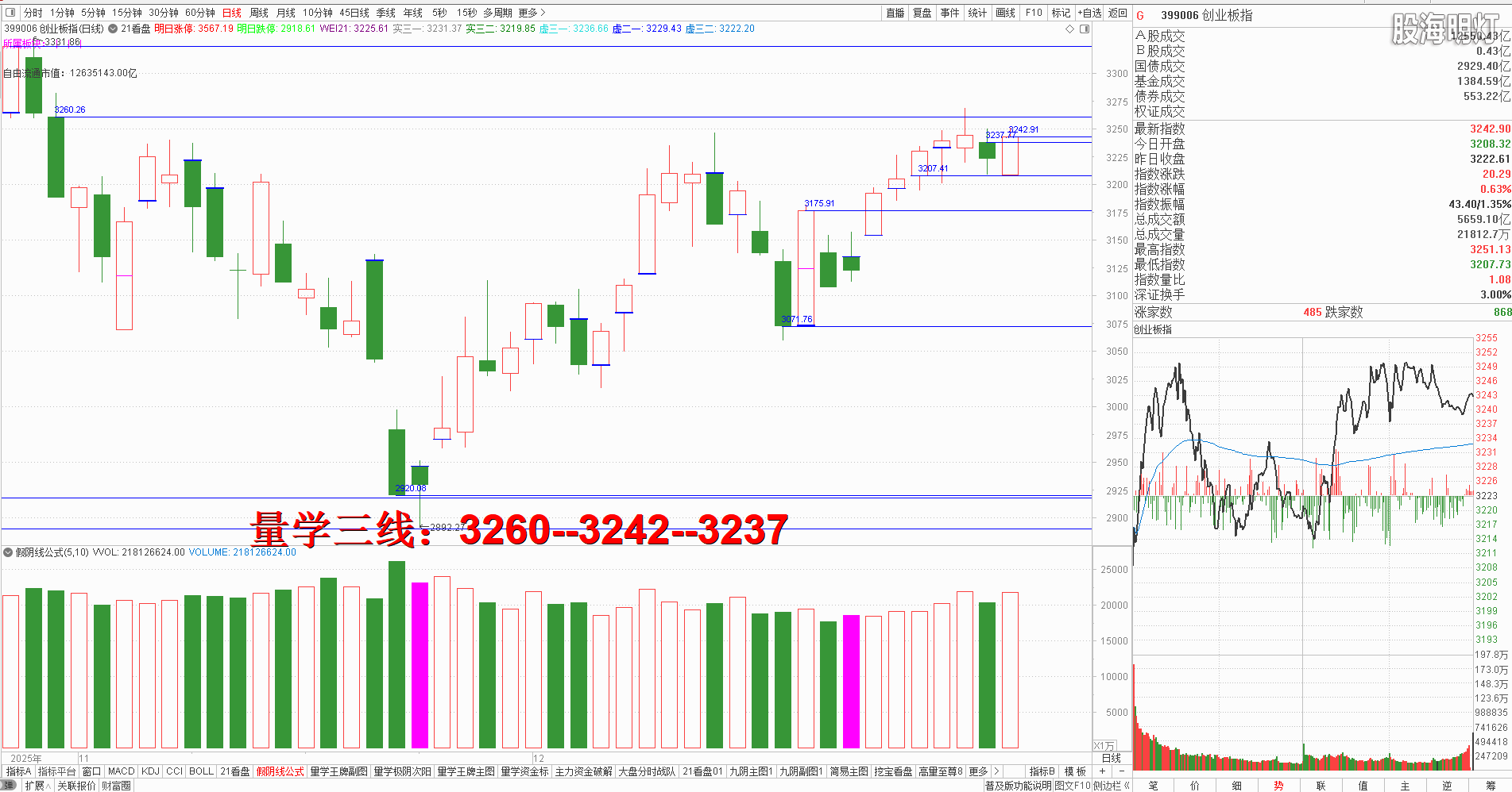 二、创业板研判:今天收盘小中阳盖阴,对应量柱微增量,今日建构属于量学双向阳胜,明日常态继续看跌,量学三段以上高手可继续模拟训练“不理指数,精练个谷”;涨停趋势依然是量学“极阴次阳回马枪战法+凹里淘金战法”为主,今日收盘3只20CM,模拟训练难度非常考验量学功底;后势涨停趋势可继续模拟学习量学凹底淘金知识点+极阴次阳回马枪+康桥战法模拟训练,要特别训练出现首跌缩量,精准回踩重要量线出现有效次阳后出现量学刹车王牌柱知识点后,看不懂量学建构,不明白量学量波技术原理,切忌盘中盲目追涨杀跌,看不懂就不要强求。模拟训练一定要训练在自己认知之内的案例,看不懂的案例还需做到:宁错过,不做错。一般人最好耐心模拟学习量学不见次阳不动心知识点。 明日量学【创业板三线】:3260--3242--3237