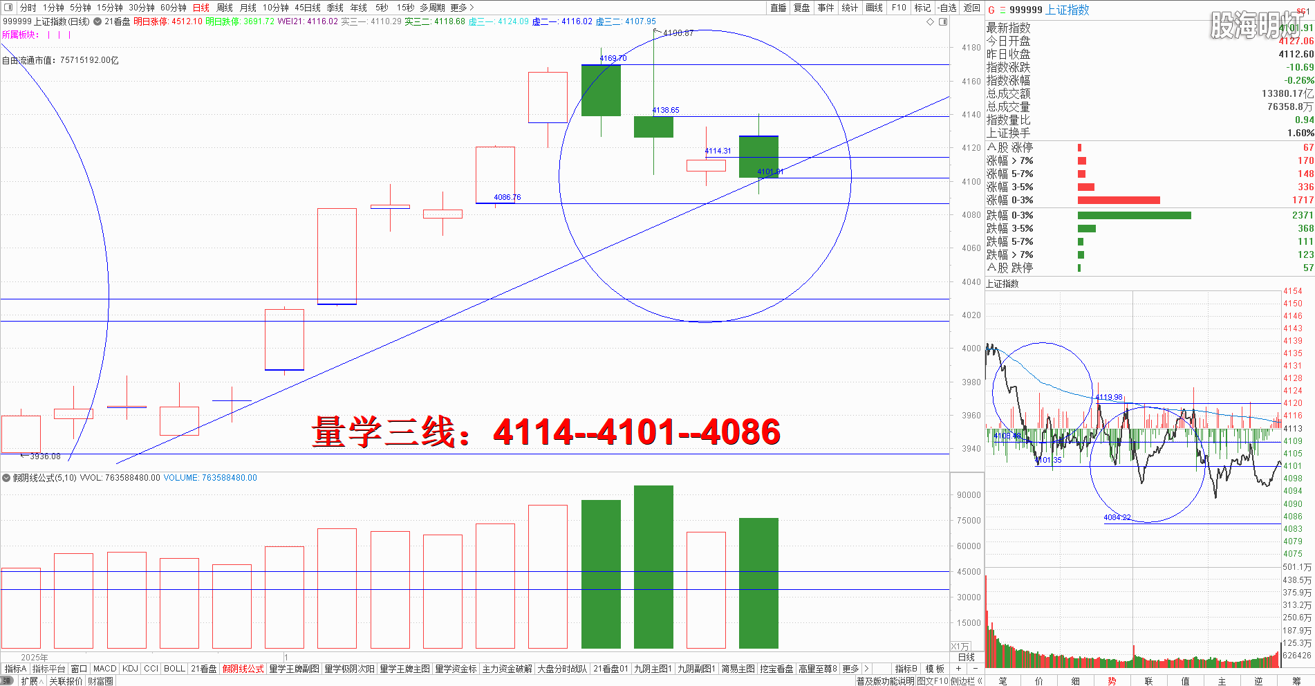 一、 昨日研判:收盘假阳真阴十字星单枪,对应量柱明显缩量,量学箴言:假阳真阴,务必当心!明日必须出现有效真阳确认今日假阳,强势应该站上昨日假阴实顶4138点上方,达标方可再次模拟接回今日高抛部分继续模拟训练量学替领精练知识点;反之确认失败谨防向下加速,已经模拟完毕防护者继续模拟学习量学不见有效次阳不动心。量学【上日三线】:4126--4112--4096.早盘竞价高开,结合量学一柱一线知识点,当前重要的一线就是高连假阴真阳实顶4138点,那么今天竞价高开就必须有效站上4138点上方不破,达标方可模拟训练接回昨日防控部分,反之不能达标就应继续逢高模拟训练量学替领防控知识点,开盘后稍作冲高,触及4138点不过分时量波形成平顶后紧跟一个峰顶下降开启跳水模式,其后反弹均不能有效站上人线,那么每一个不能站上人线的高点都是继续模拟训练高抛防控的机会,最终收盘量学假阴真阳跌破昨日假阳实底,结合今日建构与位置定性,今天的假阴实底明显低于上方高量假阴实底,今日价柱实体明显大于左侧假阳实体,周一常态应该继续惯性下探,结合开盘定势,一旦竞价低开将继续考验4086点黄金线支撑,一旦此线有效跌破需防向下惯性加速,那么稳健者继续耐心模拟学习量学不见有效次阳不动心知识点。反之,如果出现反弹不能有效阳盖今日假阳实顶,依然不能急于模拟训练,稳健者可 耐心等候量学刹车王牌出现且量性转强后的模拟学习机会。周一量学【上日三线】:4114--4101--4086.
