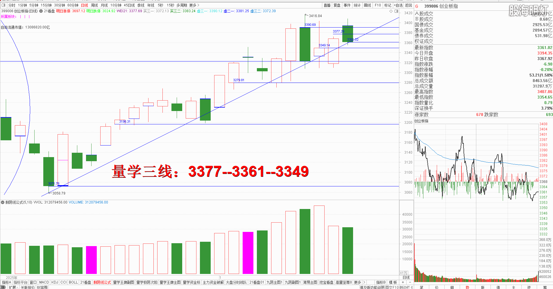 二、创业板研判:今天高开低走,收盘假阴真阳有效回补今日跳空缺口,对应量柱微缩量,周一必须次阳盖阴则后势看涨,反之继续跌破假阴实底需防继续下探,量学三段以上高手可继续模拟训练“不理指数,精练个谷”;涨停趋势依然是量学“极阴次阳回马枪战法+凹里淘金战法”为主,今日收盘6只20CM,模拟训练难度非常考验量学功底;后势涨停趋势可继续模拟学习量学凹底淘金知识点+极阴次阳回马枪+康桥战法模拟训练,要特别训练出现首跌缩量,精准回踩重要量线出现有效次阳后出现量学刹车王牌柱知识点后,看不懂量学建构,不明白量学量波技术原理,切忌盘中盲目追涨杀跌,看不懂就不要强求。模拟训练一定要训练在自己认知之内的案例,看不懂的案例还需做到:宁错过,不做错。一般人最好耐心模拟学习量学不见次阳不动心知识点。 周一量学【创业板三线】:3377--3361--3349