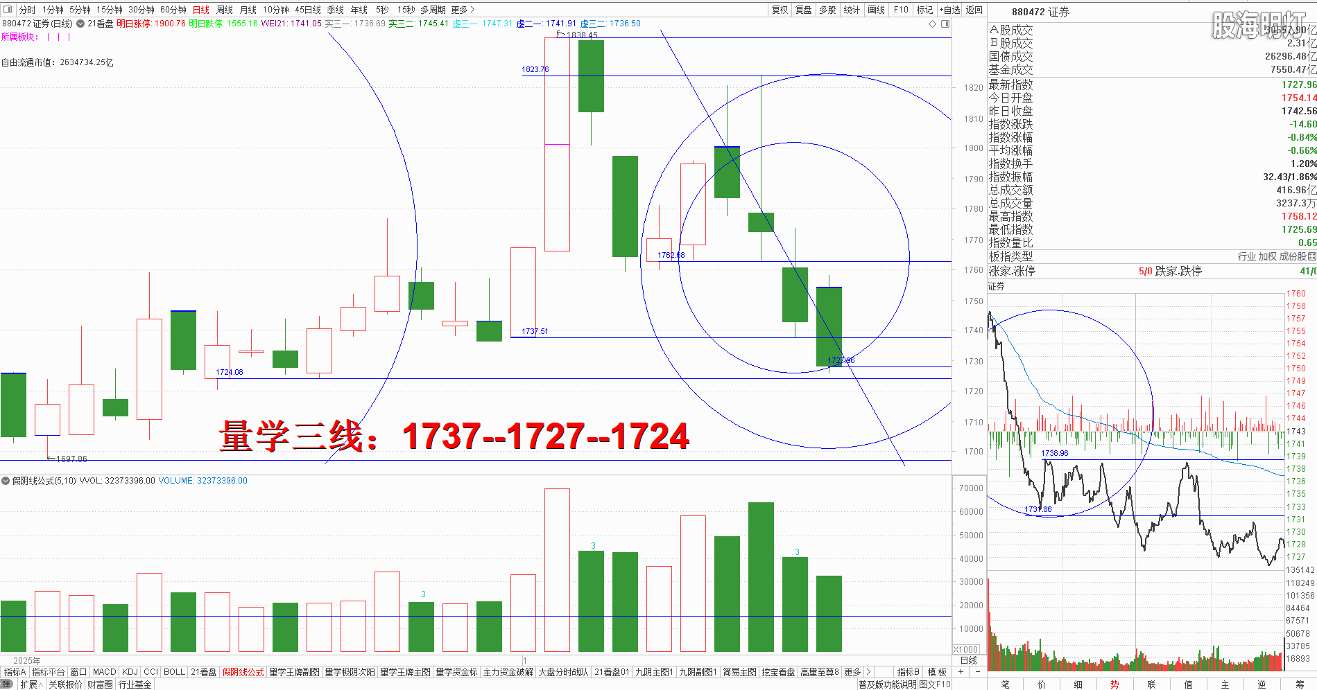 三、板块解析:行业板块【半导体,电气设备各9板第一;建筑,汽车类各7板第二房地产,工业机械各5板第三】;概念板块【芯片25板第一;新能源车,机器人各6板第二;一带一路12板第三;物联网10板第四;核电核能9板第五】;今日新科技继续热点,新能源辅助;主线方向新科技与新能源继续模拟跟踪板块轮动,主线类板块今日量性有所转强,但周一结合开盘定势需防板块出现回踩,一旦主线类开始调整,就需关注内需类是否短线活跃。风向标证券,早盘竞价高开于昨日阴半上方,但是开盘稍作上攻立刻猛烈跳水,并把人线拉下零轴,收盘中阴有效跌破最近黄金线1737点,下探至最近黄金谷底线1724点上方得到支撑后尾盘稍作反弹,周一依然处于量学一剑封喉处,周一必须次阳过阴半站稳才能引领大盘出现次阳,反之一旦竞价低开,有效跌破交叉处1724点,需防继续中大阴向下加速,一旦券券继续大跌,必然拖累大盘跟随向下,所以只要券券没有出现有效次阳之前,稳健者继续模拟训练量波不见有效次阳不动心知识点。