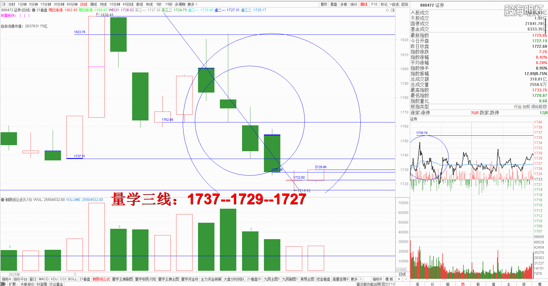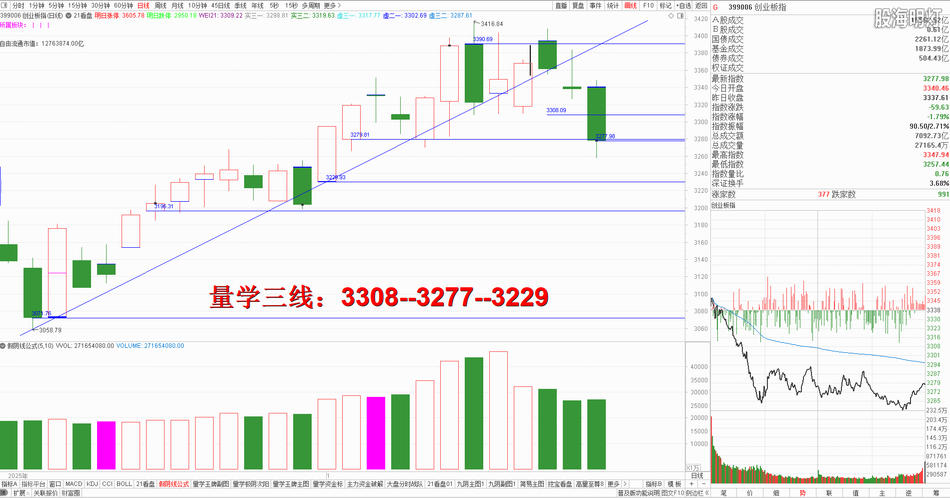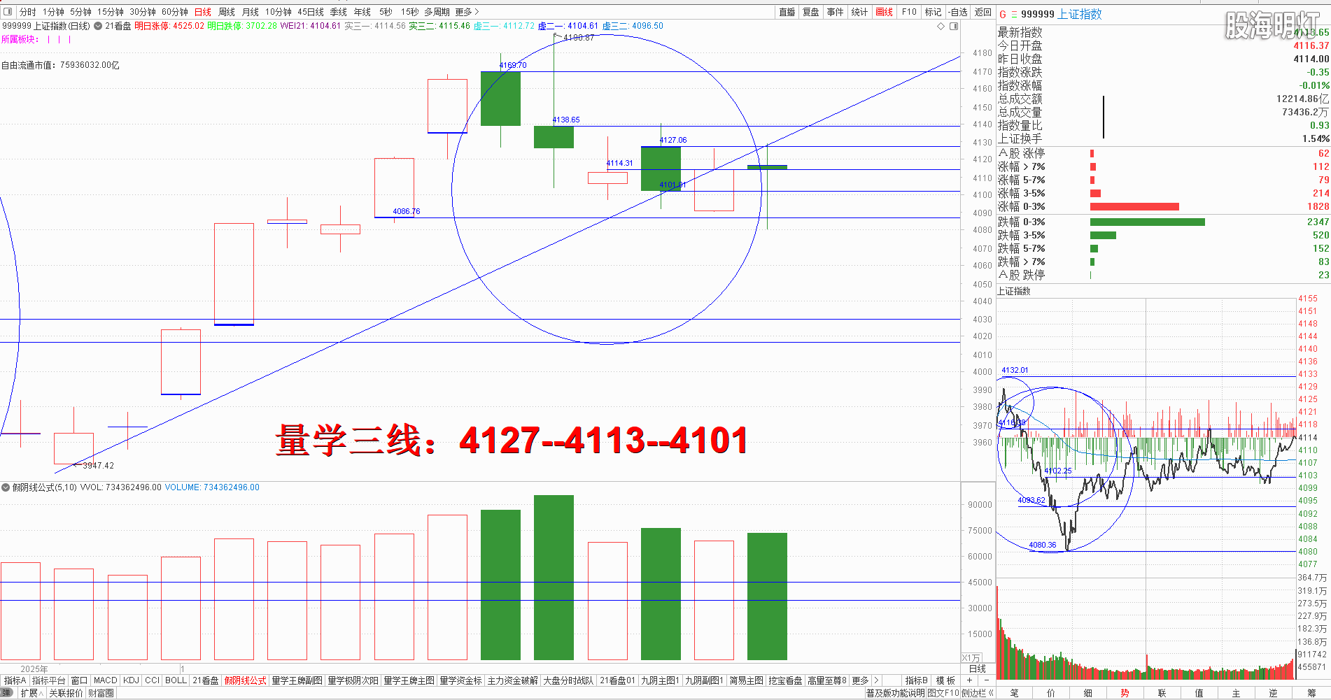 友情提示:股市有风险,入市需谨慎!本文仅代表作者个人观点,我们采用清华大学出版社、经济日报出版社和四川人民出版社《量学经典教材》,旨在记录和验证量学盘前预报,总结提升量学经验,积累历史档案,不为操盘指导,据此实盘者盈亏自负,均与作者无关!好的谷票管一阵子,好的技术管一辈子,学习改变人生,学习改变未来!我们不但教给大家量学技术,更为大家提供适合自己的量学方案,让我们快来一起学习吧! 一、 昨日研判:阳单枪还需明日真阳继续确认,结合开盘定势,一旦不能竞价高开,必须量波正三维有效站稳今日阳实顶4114点不破并继续明显缩量,且缩量越大才越安全,达标激进者方可开始首次模拟测试;反之一旦有效跌破预定下线4101点且继续跌破今日阳实底,就需谨防向下加速,稳健者继续模拟学习量学不见有效次阳不动心知识点。量学【上日三线】:4127--4114--4101.早盘竞价小幅高开,结合量学三线知识点必须量波正三维有效站稳预定上线4127点上方不破,才是对昨日次阳单枪有效确认,开盘后量波快速急拉但明显不健康,触及上线量波形成尖角波后立刻开始跳水,盘中没有任何安全模拟训练机会,其后一路深幅下探至4077点黄金线上方止跌开始反弹,这时人线已经被天线拉下零轴成为真阴,所以盘中反弹不过左峰的高点都是昨日模拟极阴次阳者逢高模拟防护的机会,稳健者应该继续不见有效次阳不动心。最终收盘小阴长腿十字星,对应量柱微增量,结合量学三先规律量柱语言解读,今天长腿有主力借助量波继续盘中洗盘的行为,单枪不过高量假阴实顶说明上方还有一定抛压需要消化,长腿短发说明今天的支撑大于压力,那么明天能否向上必须出现有效真阳盖今日阴实顶,强势应该真阳站上预定上线不破且对应量柱明显价升量缩,达标方可开始再次模拟量学替领精练知识点,反之结合开盘定势,一旦竞价低开有效跌破预定下线,说明洗盘仍未结束,这时就必须严格执行量学不见有效次阳不动心知识点,一旦有效跌破最近金线4086点,就需预防重新进入下降趋势。明日量学【上日三线】:4127--4113--4101.