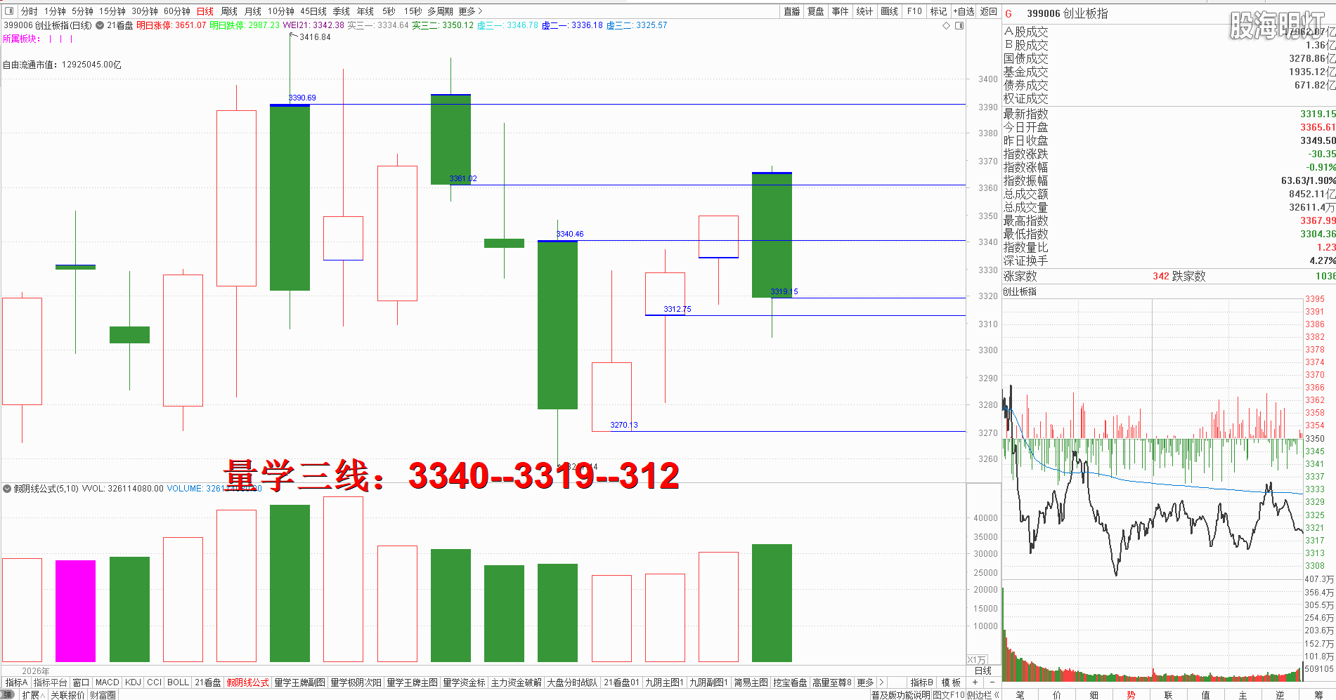 二、创业板研判:今天早盘竞价高开,开盘后受大盘影响深幅跳水回落,其后盘中震荡下行,收盘中阴对应量柱微增量,日像建构属于量学长阴短柱,明日常态示跌,变态防涨,量学三段以上高手可继续模拟训练“不理指数,精练个谷”;涨停趋势依然是量学“极阴次阳回马枪战法+凹里淘金战法”为主,今日收盘7只20CM,模拟训练难度非常考验量学功底;后势涨停趋势可继续模拟学习量学凹底淘金知识点+极阴次阳回马枪+康桥战法模拟训练,要特别训练出现首跌缩量,精准回踩重要量线出现有效次阳后出现量学刹车王牌柱知识点后,看不懂量学建构,不明白量学量波技术原理,切忌盘中盲目追涨杀跌,看不懂就不要强求。模拟训练一定要训练在自己认知之内的案例,看不懂的案例还需做到:宁错过,不做错。一般人最好耐心模拟学习量学不见次阳不动心知识点。 明日量学【创业板三线】:3340--3319--3312. 三、板块解析:行业板块【有色23板第一;医疗保健6板第二;工业机械5板第三】;概念板块【储能18板第一;光伏,黄金各17板第二;机器人14板第三;DeepSeek12板第四;芯片11板第五】;今日新能源类继续热点当热度明显降低,新内需与新科技类辅助;主线方向新科技与新能源继续模拟跟踪板块轮动,主线类板块今日量性明显转弱,明日需结合开盘定势与量学“该X不X”模拟学习。风向标证券,今天再次抡起大棍一通狂搅,盘中严重影响大盘拉升节奏,收盘阳单枪,对应量柱明显增量且形成量学梯量第三柱,明日进入“盯三防四”,结合今日建构常态示跌,变态防涨,明日结合开盘定势,一旦不能强势高开,最好能够量波正三维有效站稳今日阳实顶且对应明显缩量,如此才能配合大盘尽快构建次阳站上今日假阴实顶,反之一旦有效跌破今日阳半,继续谨防拖累大盘深幅回踩出现。