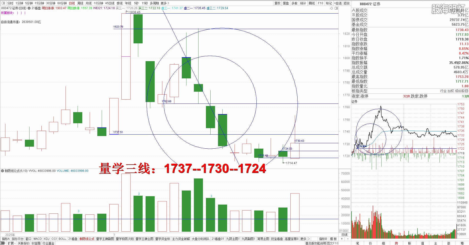 友情提示:股市有风险,入市需谨慎!本文是纯专业量学知识点分享,所有术语均出自量学五本专业教材,本文分析仅代表作者个人观点,我们采用清华大学出版社、经济日报出版社和四川人民出版社《量学经典教材》,旨在记录和验证量学盘前预报,总结提升量学经验,积累历史档案,不为操盘指导,据此实盘者盈亏自负,均与作者无关!好的谷票管一阵子,好的技术管一辈子,学习改变人生,学习改变未来!我们不但教给大家量学技术,更为大家提供适合自己的量学方案,让我们快来一起学习吧! 一、 昨日研判:结合大盘当前建构刹车王牌已经构建完成,换挡王牌还差周一将构建完成,今日量性转强,一旦周一继续跳空高开且量波正三维健康,将继续上攻最近左峰4169点,届时可结合量学峰顶线知识点模拟训练进退标准。量学【上日三线】:4138(4169)--4136--4130.早盘竞价高开于预定上线4138点上方,属于强势信号,但是风向标券券竞价低开示弱,结合券券一直以来的表现,无疑今日还需提高警惕预防券券盘中再次捣乱,那么大盘想要上攻左峰必须先站稳左侧阴半4153点上方不破且量波健康才能达标,反之还需预防冲高回落。开盘后量波急拉明显不健康,这时风向标券券量波形成歪峰,其后券券协同保险银行一同回落,引发大盘大幅跳水挖坑,其后券券回踩人线不破再次协同银行保险一同拉升,带动大盘跟随深"V”反弹,但是券券拉升明显使用量学“恐龙波”急拉,上攻至水平方向大阴实顶不过必然会出现回落,同时量学“恐龙波从哪里来,回哪里去”,只要券券回落,必然影响大盘再次跟随,果然券券尖角峰开启跳水的同时大盘立刻跟随跳水,在大盘量波跌破左峰时就是最佳的逢高模拟训练量学替领控仓的机会,其后盘中继续反复剧烈震荡,且均不能有效站稳人线上方,最终收盘量学假阴真阳十字星单枪,对应量柱明显放量,截止收盘后形成量学梯量第四柱且量性转弱,今日假阴真阳能否牵牛待涨,必须明日出现有效真阳站上今日假阴二一位即4318点百日高量上方不破,强势应该继续站上实顶上方不破方为达标,反之一旦低开后有效跌破周五阳实底4130点并继续有效补缺,必须及时做好防护,稳健者耐心等候回踩到位之后再次出现有效次阳之后的模拟训练机会。到目前为止量学重要的一柱一线依然是百日高量假阴实顶4138点一线。明日量学【上日三线】:4138(4144)--4132--4130.
