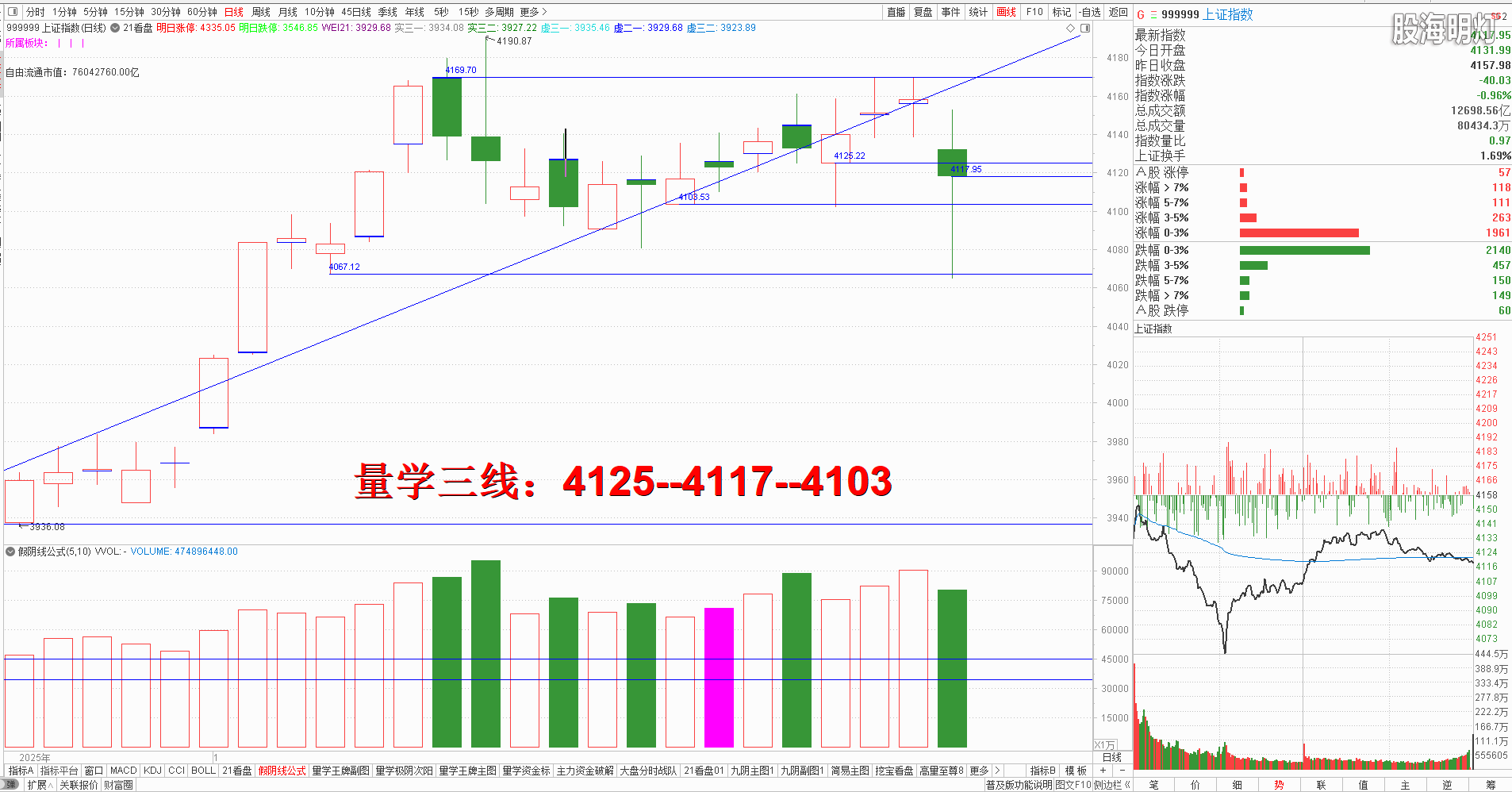 友情提示:股市有风险,入市需谨慎!本文是纯专业量学知识点分享,所有术语均出自量学五本专业教材,本文分析仅代表作者个人观点,我们采用清华大学出版社、经济日报出版社和四川人民出版社《量学经典教材》,旨在记录和验证量学盘前预报,总结提升量学经验,积累历史档案,不为操盘指导,据此实盘者盈亏自负,均与作者无关!好的谷票管一阵子,好的技术管一辈子,学习改变人生,学习改变未来!我们不但教给大家量学技术,更为大家提供适合自己的量学方案,让我们快来一起学习吧! 一、 昨日研判:大盘目前已经连续4日反复测试左峰不过,说明4169点是重要的变盘窗口,所以明日结合开盘定势,强势应该竞价高开且量波正三维有效站上4169点左峰不破,不能高开也必须量波正三维站稳左峰不破,反之一旦低开示弱且量波倒三维有效回补今日跳空缺口,需防向下加速,出现量学“打劫”知识点,量学【上日三线】:4169--4157--4151。早盘竞价跳空阴大幅低开,结合昨日收评即可预判今日必有“打劫”动作,这时就应该严格执行量学九阴真经知识点——跳空阴,拉拐清。开盘后量波快速反弹,盘中翻红假阳时就要随时做好模拟训练高抛防护的准备,在量波勾头的时候就是最佳的模拟高抛的机会,其后两次反弹均未能有效站稳人线,在风向标券券继续跳水的影响下跟随大幅跳水挖坑,其后量波形成量学“尖角波”后开始反弹,最终收盘“短发大长腿”小阴,收盘有效跌破最近黄金线4125点,对应量柱微缩量,整体属于量学长阴短柱,但是今天的长腿悬在空中给人没有踩实的感觉,周一不能快速出现有效次阳盖今日阴实顶,就需预防周一继续向下摸腿动作,既然是“打劫”必然是假跌,什么时候止跌,必须静候有效次阳出现,所以稳健者只需严格模拟学习量学不见有效次阳不动心知识点即可。周一量学【上日三线】:4125--4117--4103.