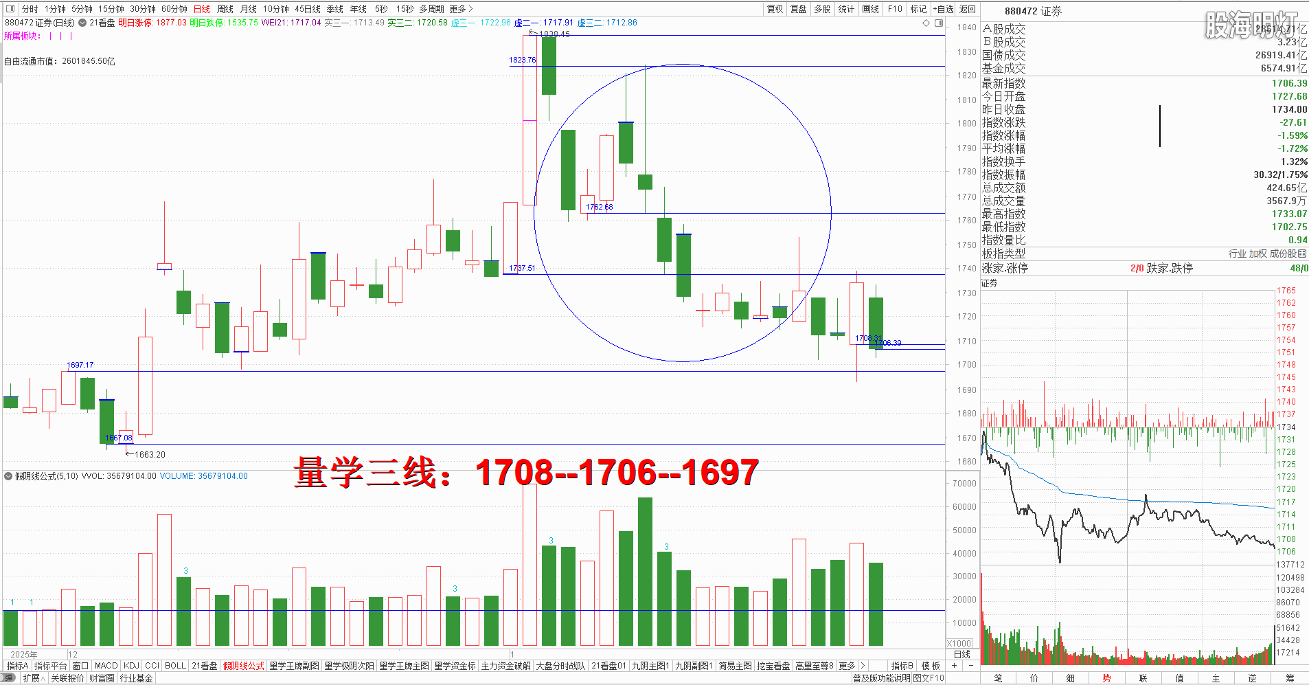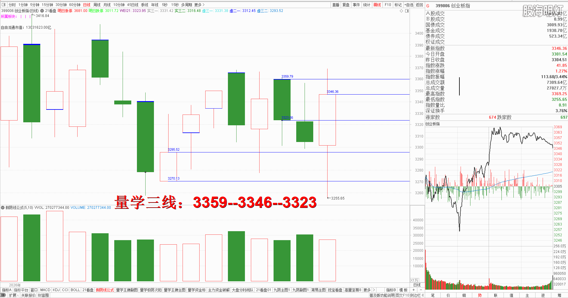 二、创业板研判:今天早盘竞价低开,开盘跟随大盘震荡且深幅挖坑,但其后借助大盘力量快速拉升,下午开盘后继续急拉,并把人线拉上零轴,收盘中阳长腿单枪,对应量柱微缩量,今日建构属于量学价升量缩,但是距离今日上方还有双重大阴实顶压制,周一不能竞价高开,就需预防出现“阴回马”,量学三段以上高手可继续模拟训练“不理指数,精练个谷”;涨停趋势依然是量学“极阴次阳回马枪战法+凹里淘金战法”为主,今日收盘3只20CM,模拟训练难度非常考验量学功底;后势涨停趋势可继续模拟学习量学凹底淘金知识点+极阴次阳回马枪+康桥战法模拟训练,要特别训练出现首跌缩量,精准回踩重要量线出现有效次阳后出现量学刹车王牌柱知识点后,看不懂量学建构,不明白量学量波技术原理,切忌盘中盲目追涨杀跌,看不懂就不要强求。模拟训练一定要训练在自己认知之内的案例,看不懂的案例还需做到:宁错过,不做错。一般人最好耐心模拟学习量学不见次阳不动心知识点。 周一量学【创业板三线】:3359--3345--3323. 三、板块解析:行业板块【化工7板第一;元器件,工业机械,农林牧渔各5板第二;通信设备,建筑各4板第三】;概念板块【新能源车18板第一;芯片13板第二;5G,11板第三】; 昨日黄金概念今日大幅跳空阴开盘如期回落;新能源今日热点,新科技类辅助; 昨日白酒概念一马当先,今日果然成昙花一现;主线方向新科技与新能源继续模拟跟踪板块轮动,主线类板块今日普遍假阳长腿,稳健者应该模拟学习量学不见有效次阳不动心或耐心等候真阳确认之后。 风向标证券,早盘低开示弱,开盘先拉后跌快速跳水下行,收盘中阴跌破昨日次阳实底,说明昨日次阳助涨的功能已经失效,常态还应继续下行寻底,变态必须快速出现有效阳盖今日阴实顶,结合开盘定势,一旦周一跳空低开且有效跌破预定下线,必然继续拖累大盘向下摸腿,不得不防。