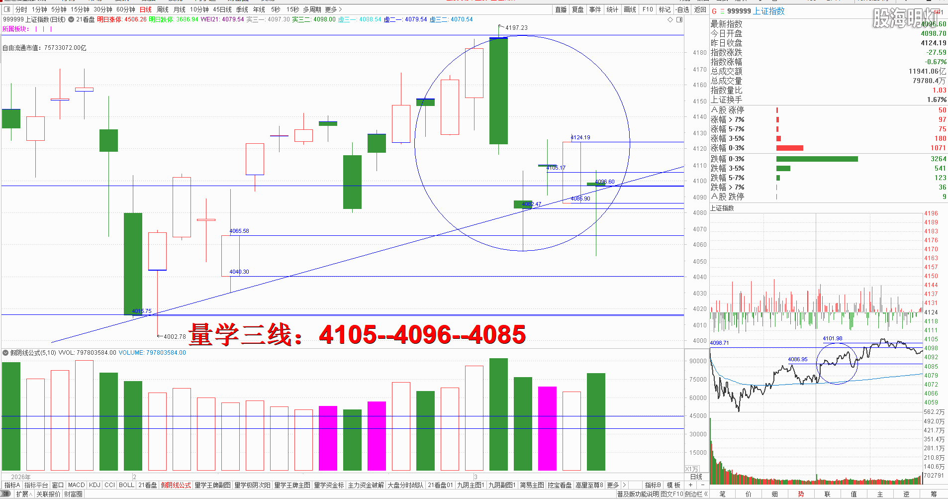 友情提示:股市有风险,入市需谨慎!本文是纯专业量学知识点分享,所有术语均出自量学五本专业教材,本文分析仅代表作者个人观点,我们采用清华大学出版社、经济日报出版社和四川人民出版社《量学经典教材》,旨在记录和验证量学盘前预报,总结提升量学经验,积累历史档案,不为操盘指导,据此实盘者盈亏自负,均与作者无关!好的谷票管一阵子,好的技术管一辈子,学习改变人生,学习改变未来!我们不但教给大家量学技术,更为大家提供适合自己的量学方案,让我们快来一起学习吧! 一、 昨日研判:周一结合开盘定势,强势应该竞价高开且量波正三维快速站稳前期4138点高量假阴实顶才能继续上攻4151高量大阴二一位;不能竞价高开即为示弱信号,能够继续模拟精练的标准必须量波正三维有效站稳今日阳实顶,反之一旦有效跌破预定下线4116点,就需预防出现阴回马,之所以要有这种预判,是从大盘周线级别来看本周放量阴长腿跌破上周阳实底,一旦下周不能快速出现阳线反包本周阴实顶,就需预防周线级别出现下探动作,而且不得不防。周一量学【上日三线】:4138--4124--4116. 今天收盘小阴长腿十字星,验证了周五预判,收盘点位精准对应 0115号假阳虚底形成精准线,对应量柱明显增量,结合三先规律量柱语言解读首先是今天继续遭遇较大抛压的表现,收盘位置处于周五次阳下三一位,属于弱势调整位,量柱增量属于量学九阴真经量柱三阴——阴过阳。所以今天没有任何可以安全模拟学习训练的标准,应该结合手中持有模拟案例的位置,建构与最近压力逢高模拟训练量学替领防控知识点,今天的精准线与我们提前预设的太极线与明日二龙交叉,因为今日精准线质量较差,所以明日可模拟学习量学二龙定位处,叉上可能将有中阳,叉下可能将有中阴,结合开盘定势,强势竞价高开且量波正三维有效站稳预定上线即阳半不破,就是可以继续模拟训练量学替领精练的标准;反之一旦跌破叉下,稳健者继续模拟训练量学防控后,接着模拟训练学习量学不见有效次阳不动心知识点,在方向不明的时候,我们最好多等一等,不要羡慕也不要嫉妒谁盘中大涨,模拟训练时一定要在自己认知内的安全标准再模拟训练不迟,明日量学【上日三线】:4105--4096--4085. 。