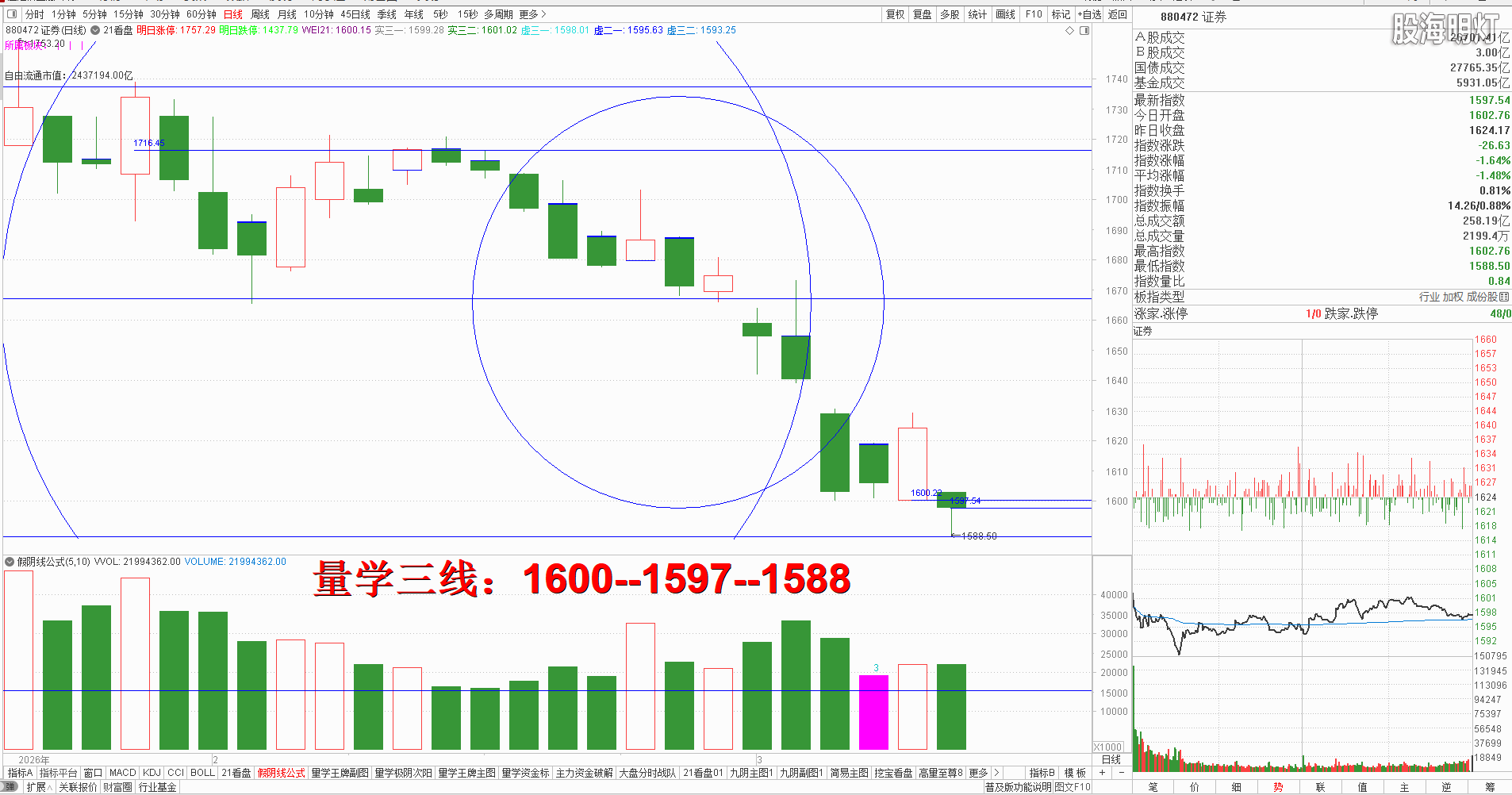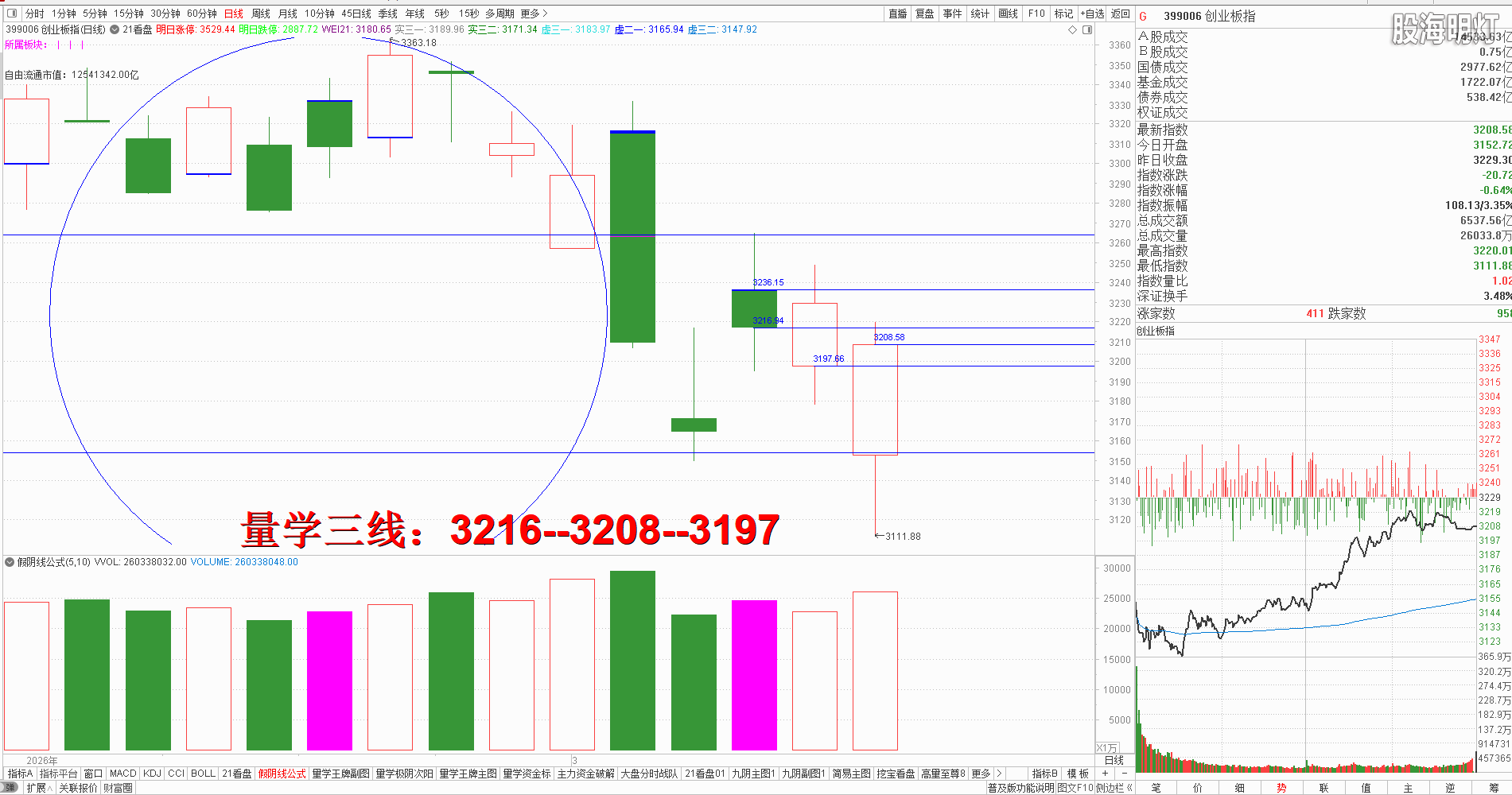 二、创业板研判:今天低开高走,收盘中阳假阳,对应量柱微增量,明日还需有效真阳确认,不能确认还有反复。量学三段以上高手可继续模拟训练“不理指数,精练个谷”;涨停趋势依然是量学“极阴次阳回马枪战法+凹里淘金战法”为主,今日收盘15只20CM,模拟训练难度非常考验量学功底;后势涨停趋势可继续模拟学习量学凹底淘金知识点+极阴次阳回马枪+康桥战法模拟训练,要特别训练出现首跌缩量,精准回踩重要量线出现有效次阳后出现量学刹车王牌柱知识点后,看不懂量学建构,不明白量学量波技术原理,切忌盘中盲目追涨杀跌,看不懂就不要强求。模拟训练一定要训练在自己认知之内的案例,看不懂的案例还需做到:宁错过,不做错。一般人最好耐心模拟学习量学不见次阳不动心知识点。 明日量学【创业板三线】:3216--3208--3197。 三、板块解析:行业板块【软件服务9板第一;电气设备7板第二;电力6板第三】;概念板块【东数西算20板第一;数据中心19板第二;人工智能16板第三;算力租赁,光伏各15板第四;DeepSeek13板第五】; 今天新科技热点,新能源类辅助;后势继续跟踪主线板块新科技与新能源类轮动,短线级别还需预防板块调整并结合快进快出知识点模拟学习; 有色板块今日收盘假阳长腿,对应量柱微增量,破坏0304号预定王牌基柱,后势还需有效真阳确认,不能确认需防“摸腿”;黄金概念今日低开回踩后反弹,收盘长腿假阳,收盘量学刹车王牌已经构建完成,但是今日量性不强,还需明日真阳确认,结合开判定,去模拟观察能否竞价高开且量波正三维,达标可模拟训练量学极阴次阳知识点。 风向标证券,早盘竞价大幅低开示弱,收盘小阴长腿跌破周五次阳实底,对应量柱平量于周五量柱,出现量学九阴真经之量柱三阴——阴平阳。明日一旦有效跌破今日阴实底将继续拖累大盘反弹节奏,稳健者耐心学习量学不见有效次阳不动心知识点为佳,稳重者可模拟训练学习出现量学刹车王牌柱且量性转强后的模拟训练机会。 四、涨停趋势:跳空阳战法+极阴次阳战法+凹里淘金战法+回马枪战法+三低三有战法,学习可参照量学五大天经教材《伏击涨停》,《涨停密码》相关章节内容学习。
