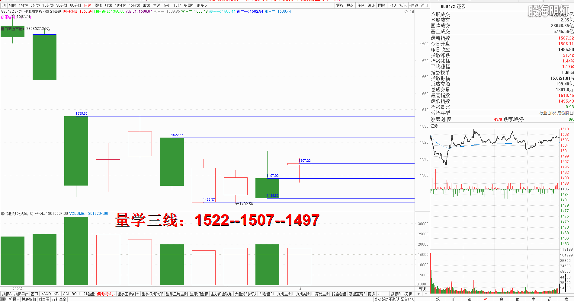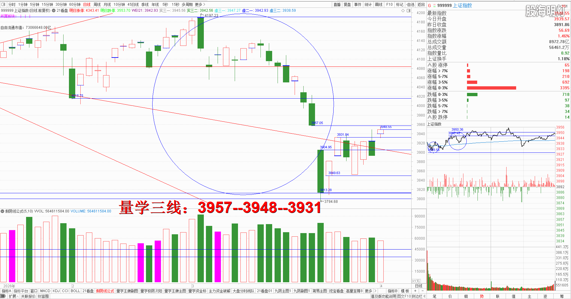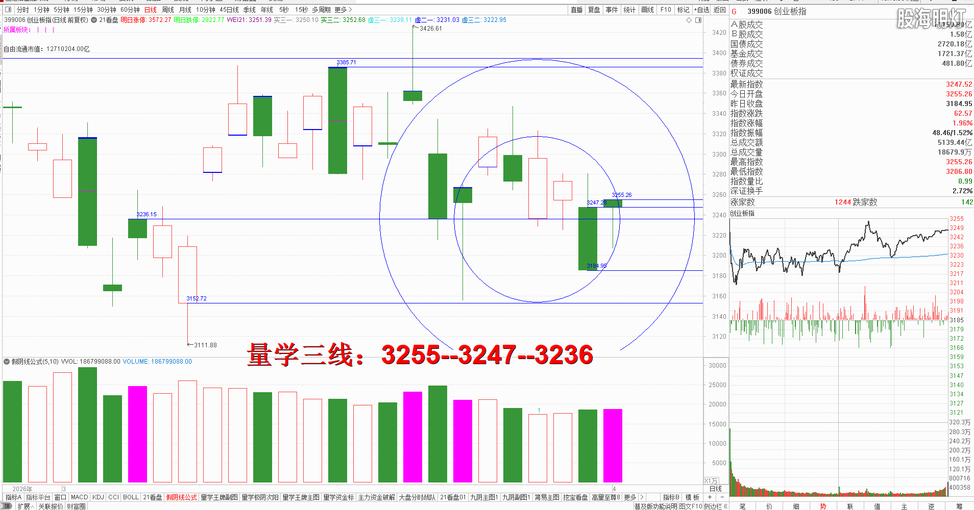 友情提示:股市有风险,入市需谨慎!本文是纯专业量学知识点分享,所有术语均出自量学五本专业教材,本文分析仅代表作者个人观点,我们采用清华大学出版社、经济日报出版社和四川人民出版社《量学经典教材》,旨在记录和验证量学盘前预报,总结提升量学经验,积累历史档案,不为操盘指导,据此实盘者盈亏自负,均与作者无关!好的谷票管一阵子,好的技术管一辈子,学习改变人生,学习改变未来!我们不但教给大家量学技术,更为大家提供适合自己的量学方案,让我们快来一起学习吧! 一、 昨日研判:明日将是重要的“变盘窗口”,结合开盘定势,强势应该竞价高开且量波正三维有效站上预定上线3904点高量大阴实顶不破并阳盖今日假阴实顶;反之一旦竞价低开不能量波正三维有效站稳3904点上方,一旦掉头向下有效跌破3884点,将以会向下加速以中到大阴下探3849点黄金线支撑,一旦3849点有效跌破,谨防重新进入下降趋势。明日量学【上日三线】:3904--3891--3884(3849)。早盘竞价高开与昨日阴实顶上方,是明显的强势信号,那么开盘量波只要有效站稳人线上方即可模拟接回昨日高抛部分,继续模拟训练量学替领精练知识点,开盘后量波受风向标券券跳水影响跟随震荡挖坑,其后站稳人线后向上攻击3957点缺口不能有效回补,其后每一个不能回补缺口的高点都是继续逢高模拟替领机会,最终收盘小阳十字星对应量柱明显缩量验证昨日变盘预判,明日结合开盘定势,强势应该继续竞价高开,一旦量波正三维有效补缺即可继续模拟训练量学替领精练知识点;反之不能高开就有回踩3931点凹间峰确认的需求,只要不破3931并继续站稳今日阳实顶仍可继续模拟训练量学替领精练知识点。明日量学【上日三线】:3957--3948--3931. 二、创业板研判:今天收盘量学长腿假阴真阳,收盘价精准对应昨日大阴实顶,对应量柱平量昨日阴柱,明日只要出现真阳确认,即可大胆模拟训练量学极阴次阳知识点。量学三段以上高手可继续模拟训练“不理指数,精练个谷”;涨停趋势依然是量学“极阴次阳回马枪战法+凹里淘金战法”为主,今日收盘6只20CM,可见今日人品低迷且模拟训练难度明显增大,模拟训练难度非常考验量学功底;后势涨停趋势可继续模拟学习量学凹底淘金知识点+极阴次阳回马枪+康桥战法模拟训练,要特别训练出现首跌缩量,精准回踩重要量线出现有效次阳后出现量学刹车王牌柱知识点后,看不懂量学建构,不明白量学量波技术原理,切忌盘中盲目追涨杀跌,看不懂就不要强求。模拟训练一定要训练在自己认知之内的案例,看不懂的案例还需做到:宁错过,不做错。一般人最好耐心模拟学习量学不见次阳不动心知识点。 明日量学【创业板三线】:3255--3247--3236。 三、板块解析:行业板块【医药12板第一;工业机械6板第二;通信设备,建筑各4板第三】;概念板块【数据中心14板第一;创新药13板第二;新能源车,东数西算各11板第三】。今天新科技类热点,新能源类与新内需辅助;后势继续跟踪主线板块新科技与新能源类轮动,主线类板块 数据中心,机器人仍可继续关注; 短线级别医药,医疗保健类仍可继续跟踪学习但须结合快进快出。 风向标证券,早盘竞价高开后,开盘即快速跳水挖坑,且继续严重影响大盘反弹节奏,收盘小阳长腿十字星,对应量柱微缩量,明日强势应该继续竞价高开,只要量波健康并站上最近大阴实顶1522点上方,即可继续引领大盘上攻,截止今天券券刹车王牌柱已经构建完成,且今日价升量缩量性转强,后势一旦可以继续构建换挡王牌柱且量性转强,才能继续引领大盘继续反弹,反之一旦券券震荡必然影响大盘跟随震荡。 四、涨停趋势:跳空阳战法+极阴次阳战法+凹里淘金战法+回马枪战法+三低三有战法,学习可参照量学五大天经教材《伏击涨停》,《涨停密码》相关章节内容学习。
