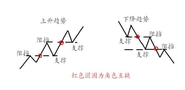 研究个股的支撑位与阻挡位可以给交易者在市场趋势中进行加仓与减仓操作指导。 个股在下降趋势中研究的意义不大,原因是市场的大环境是熊市时候,交易者正确的操作策略是现金为王。 而在牛市或上升趋势中研究支撑位与阻挡位可以提高资金利用率及降低资金的风险,使交易者对股价的运行的停顿、转折、幅度做到心中有数。 支撑位与阻挡位在趋势中的示意图: